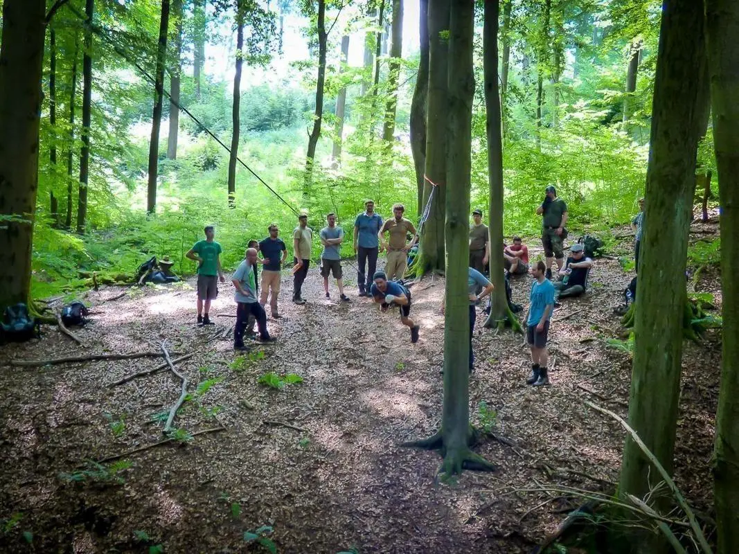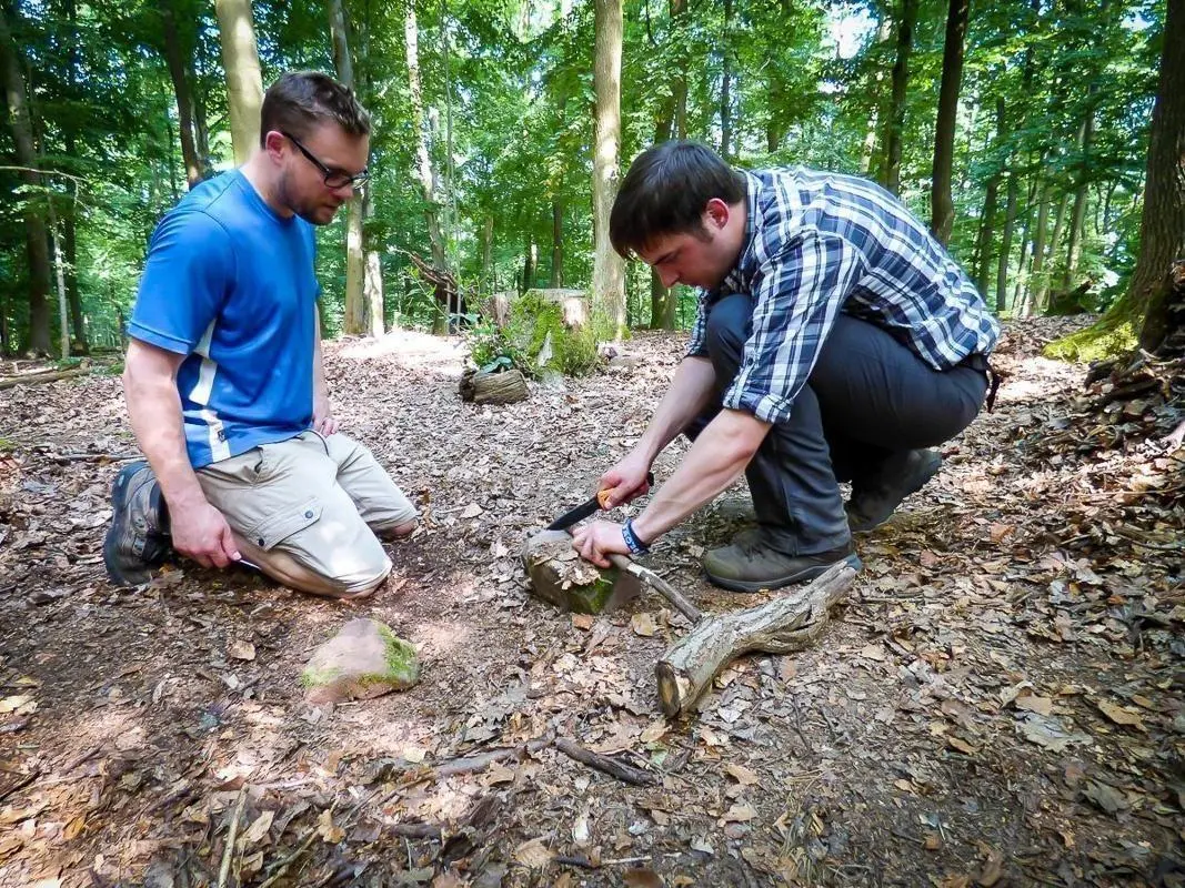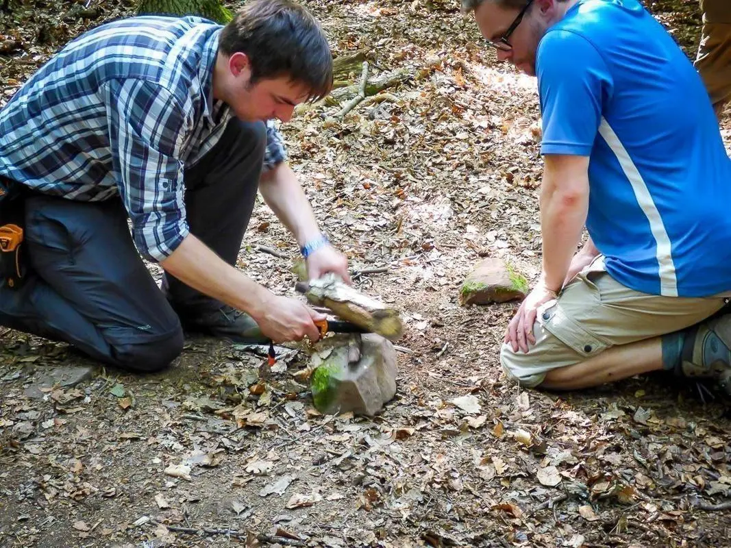 Gruppierung arbeitet an einem Holzstück im Wald, konzentriert auf eine Technik