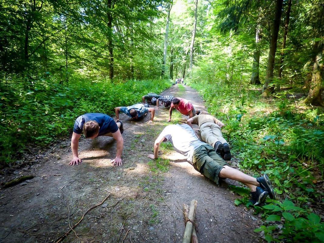 Gruppentraining mit Liegestützen auf einem Waldweg zwischen Bäumen und Sträuchern