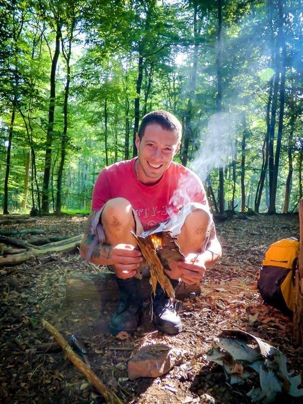 Zwei Personen bereiten Zunder auf dem Boden vor und nutzen Holzstücke