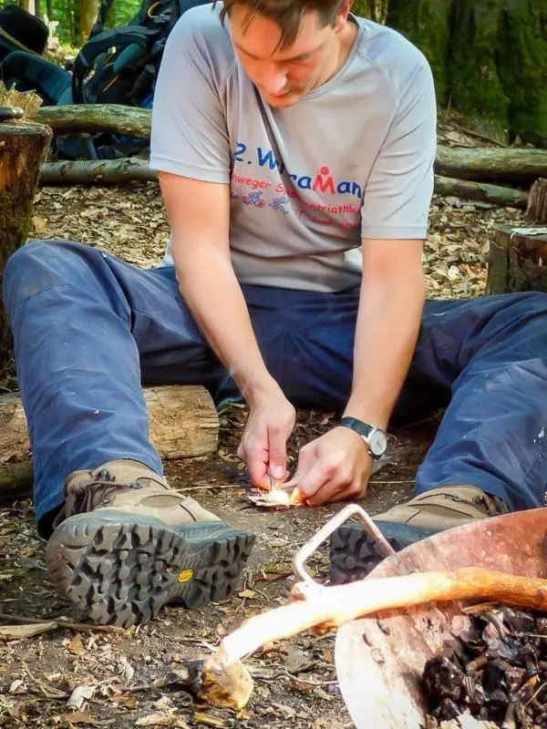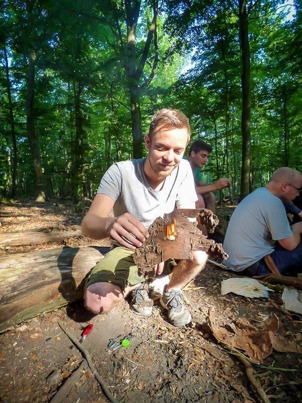Ein weiterer wichtiger Bestandteil des Trainings war der Fallenbau. Die Gruppe konstruierte verschiedene Fallen, um potenzielle Nahrungsquellen zu sichern. Dies förderte nicht nur das Verständnis für die Nahrungsbeschaffung, sondern auch die Teamarbeit und Kreativität der Teilnehmer. Das Entzünden von Feuer mit Zunder und das sichere Arbeiten mit dem Messer waren ebenfalls zentrale Themen, die den Teilnehmern halfen, Vertrauen in ihre Fähigkeiten zu entwickeln.