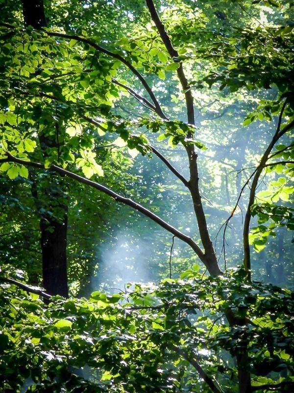 Lichtstrahlen durchbrechen das Blätterdach im Wald, Rauch schwebt zwischen den Bäumen