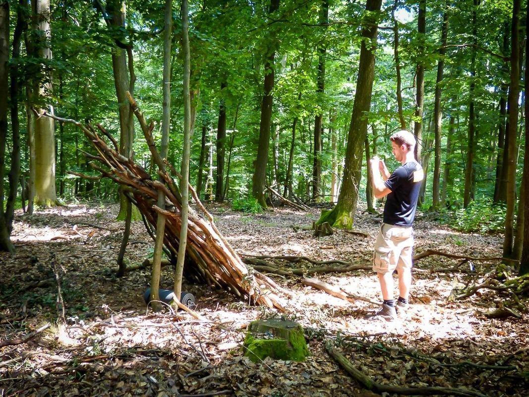 Mann fotografiert selbstgebaute Laubhütte im Wald