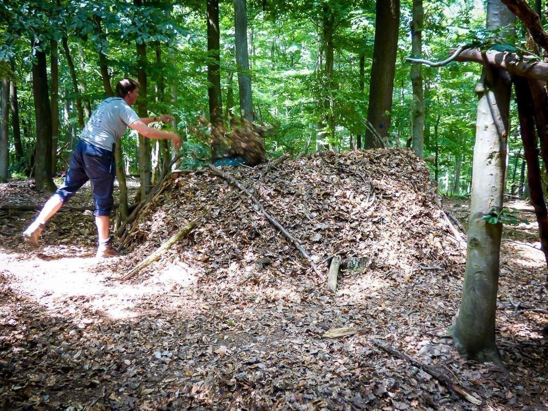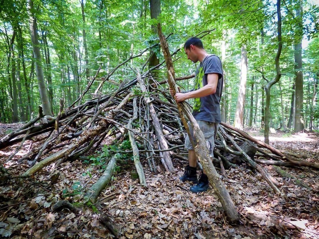 Selbstgebaute Notunterkunft aus Ästen wird mit Laub verkleidet