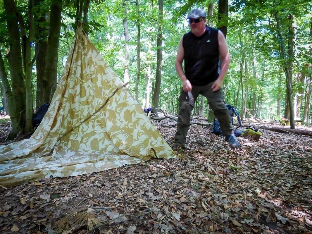 Mann richtet Tarp-Notunterkunft im Wald auf, umgeben von Laub und Bäumen
