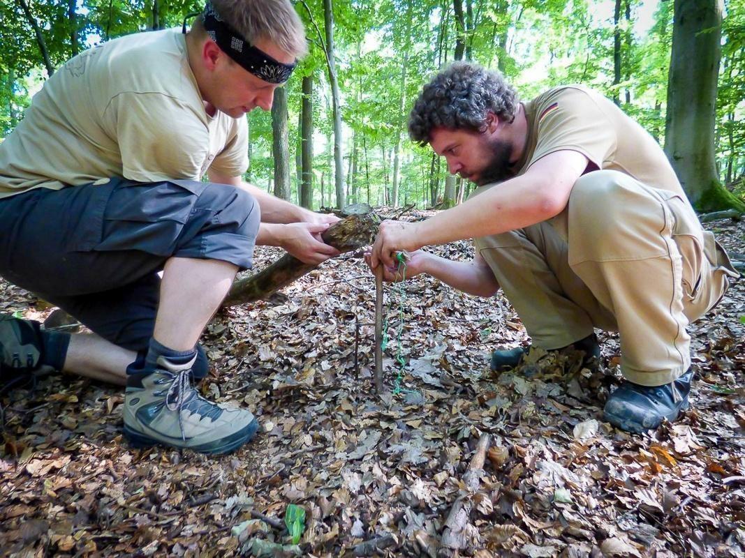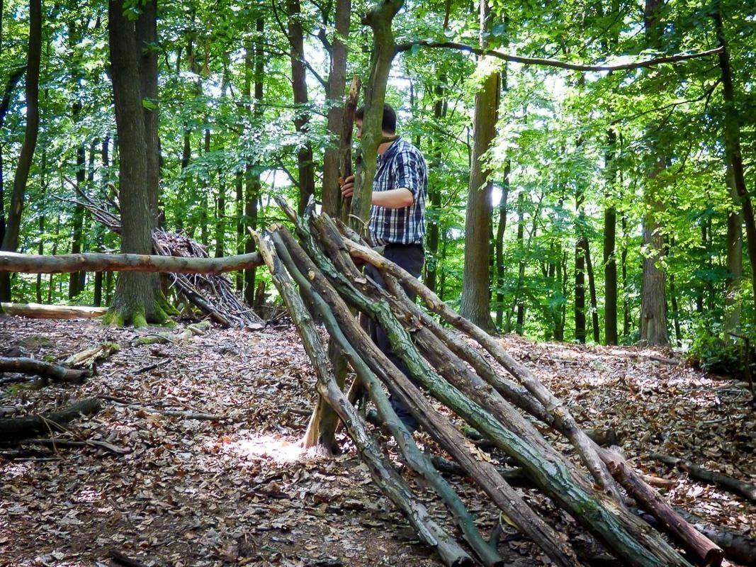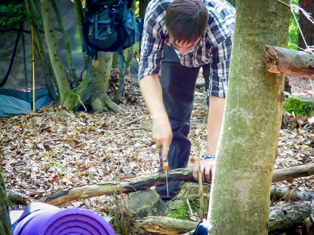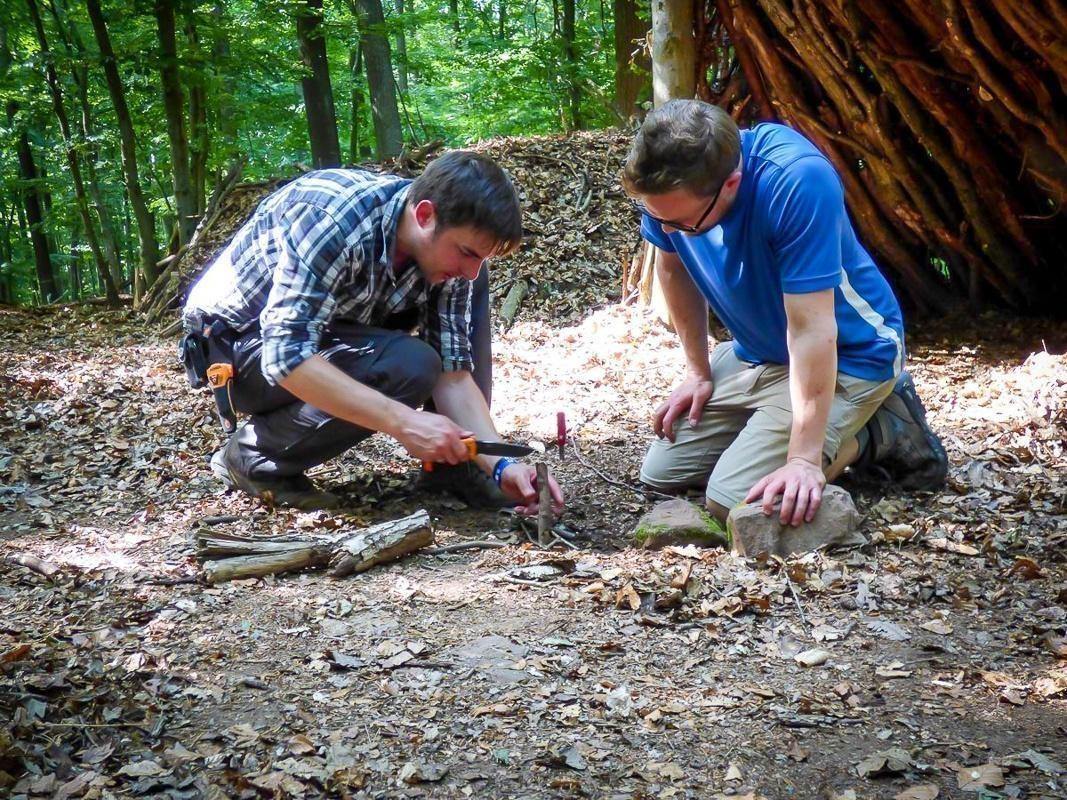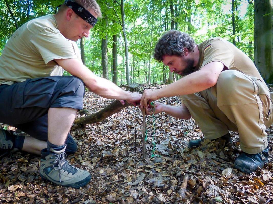 Die Teilnehmer bauten Unterstände, um sich vor den Elementen zu schützen. Dabei kamen verschiedene Knoten- und Schnurtechniken zum Einsatz, die für die Stabilität der Konstruktionen sorgten. Im Verlauf des Kurses schnitzten die Teilnehmer mit Messern, um Werkzeuge herzustellen und Materialien zu bearbeiten. Diese Fähigkeiten sind essenziell, um in der Natur improvisieren zu können und sich mit den vorhandenen Ressourcen zu versorgen.