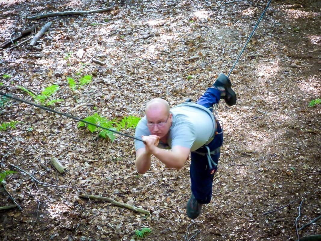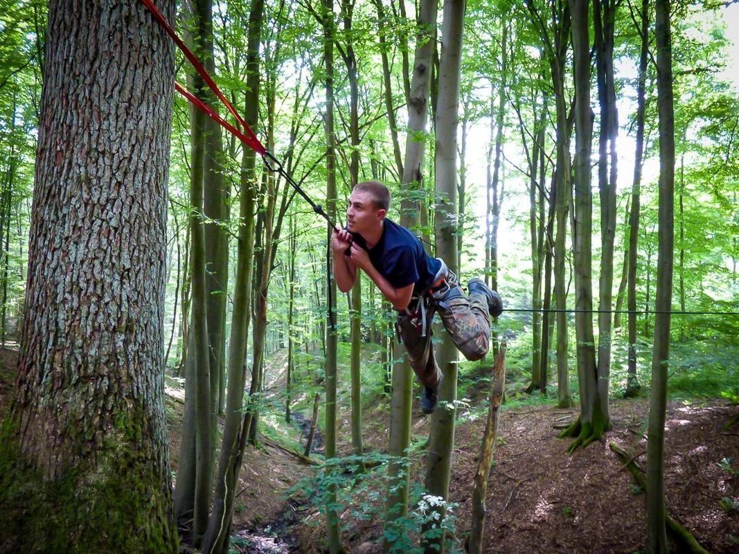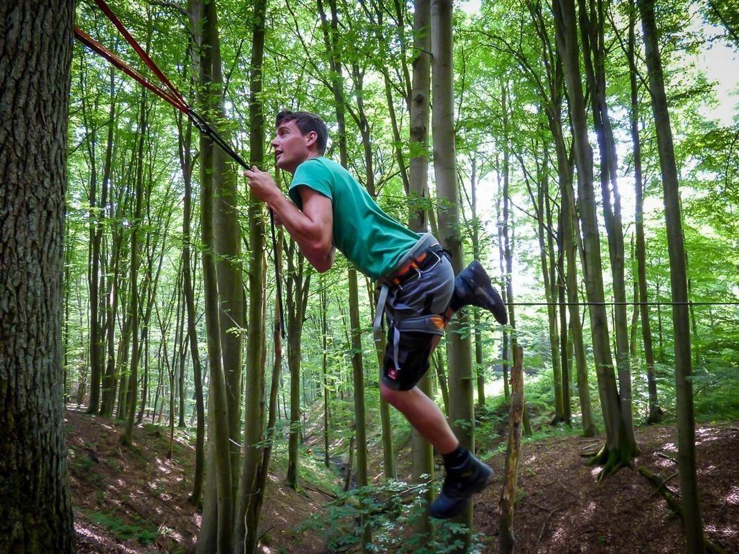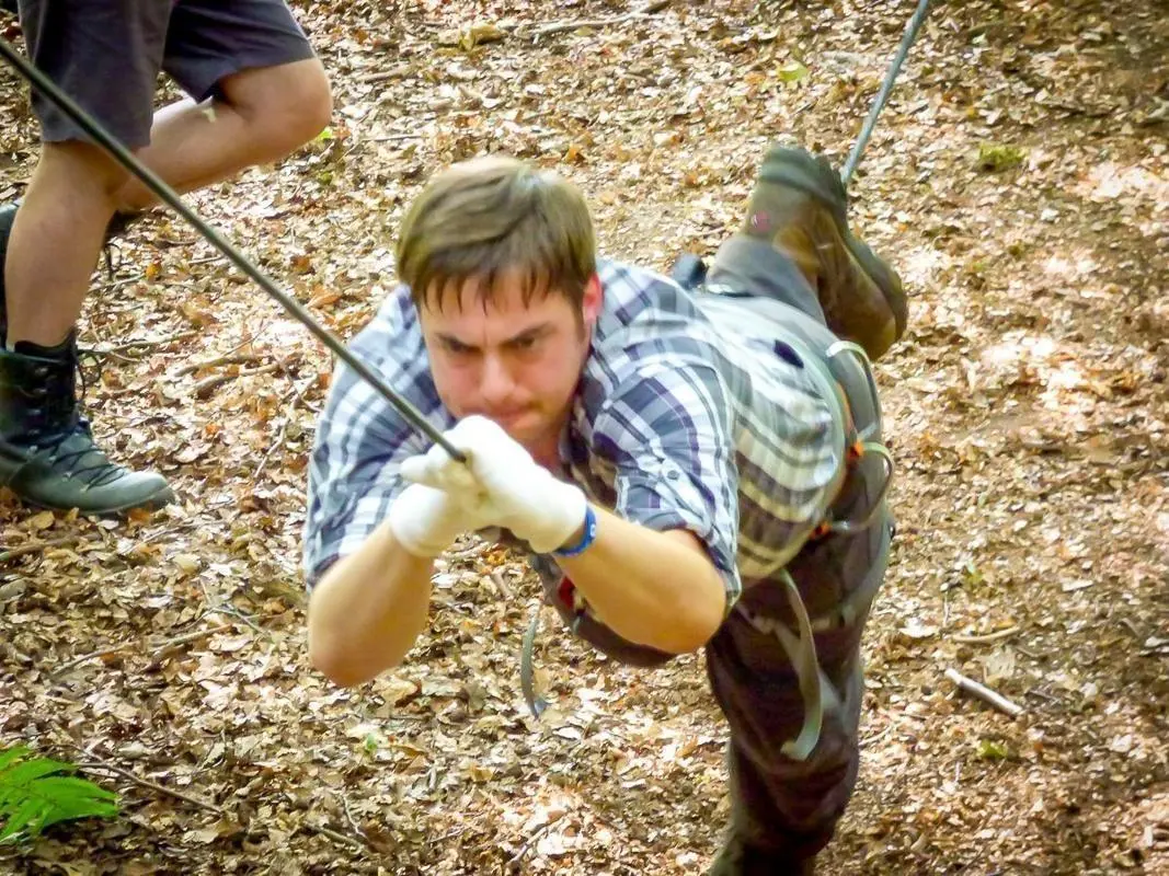 Mann zieht sich an einem Seil in einem Waldgebiet hoch