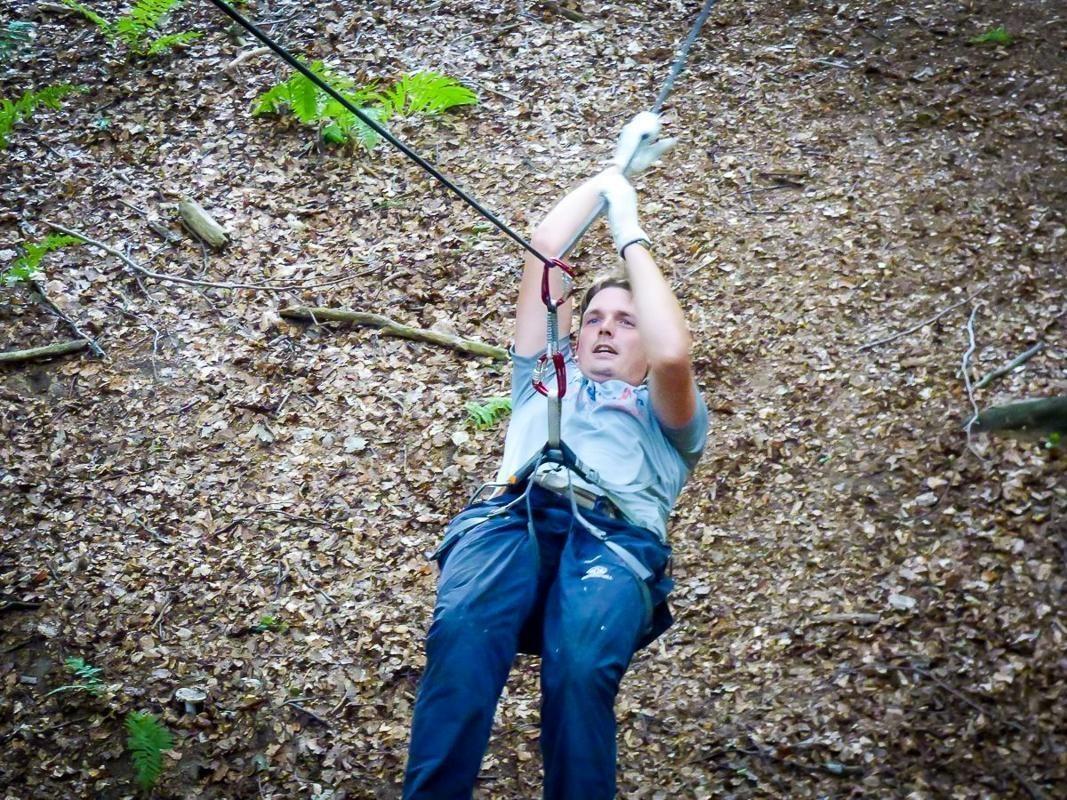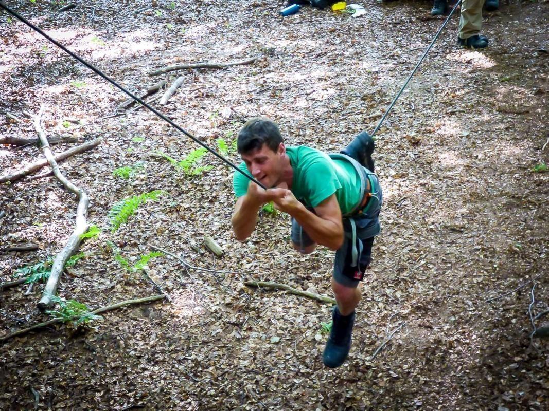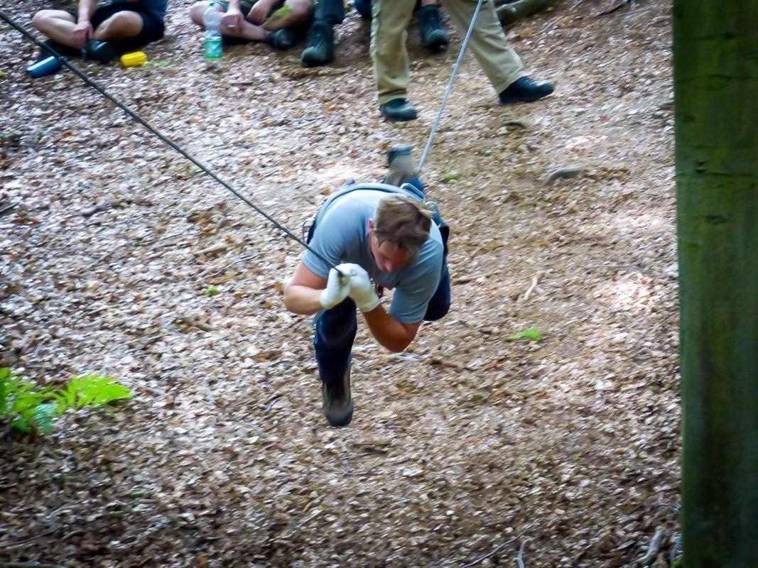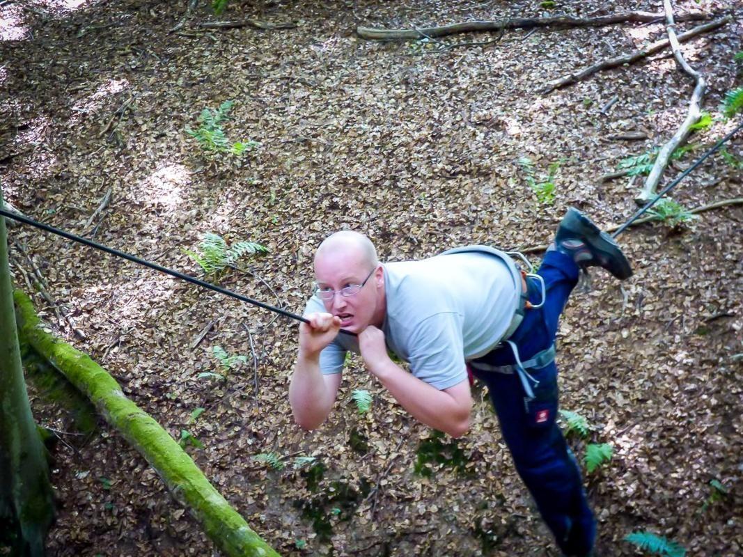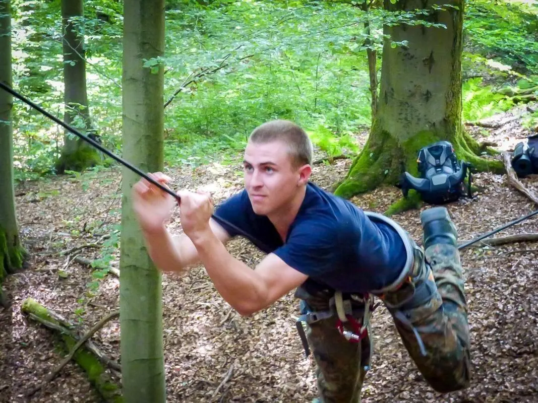 Mann zieht sich an einem Seil in einem Waldgebiet hoch