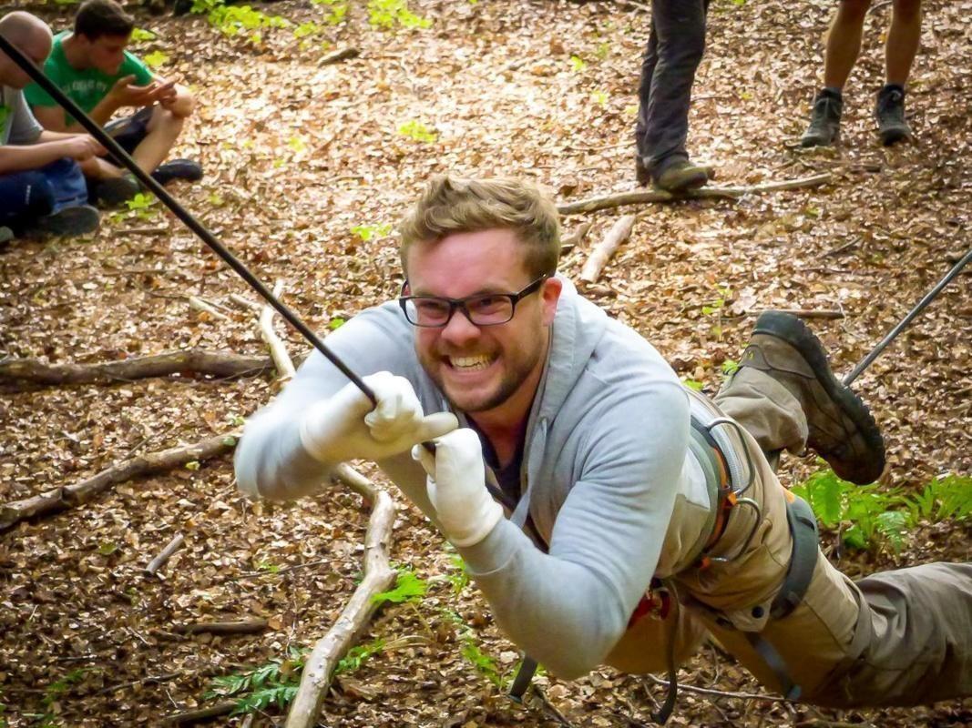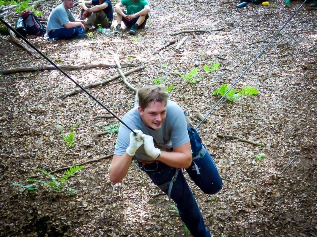 Mann überquert selbstgebaute Seilbrücke im Wald, gesichert mit Seil und Karabiner