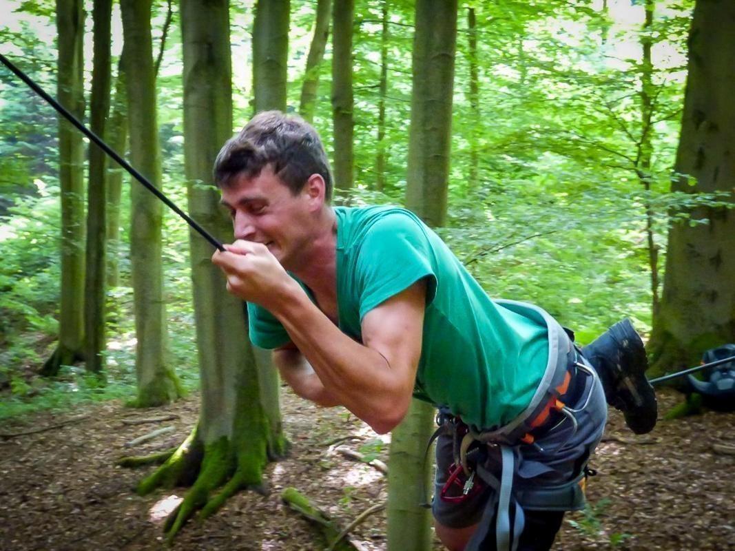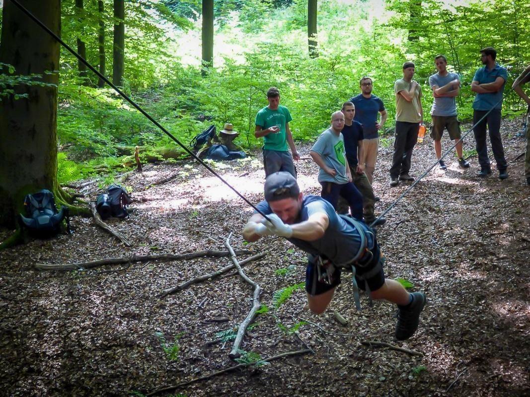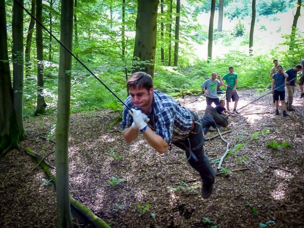 Selbstgebaute Seilquerung zwischen Bäumen wird aktiv überquert