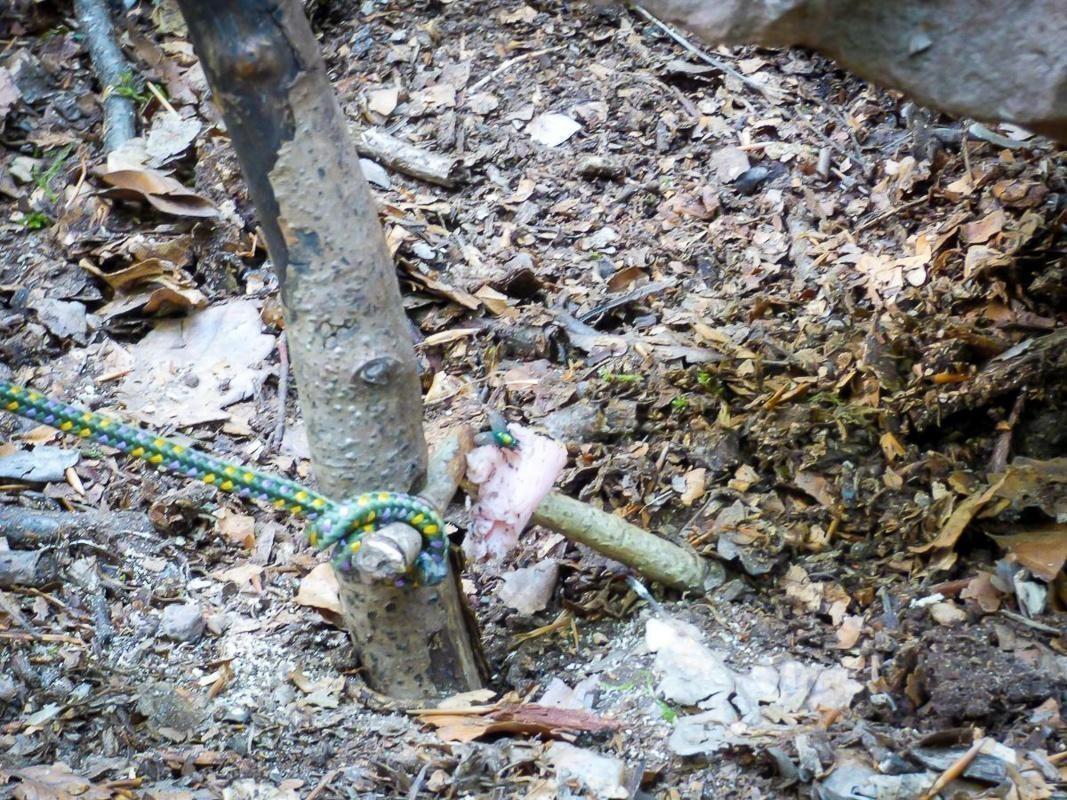 Seil um einen Baumstamm mit einem improvisierten Knoten befestigt