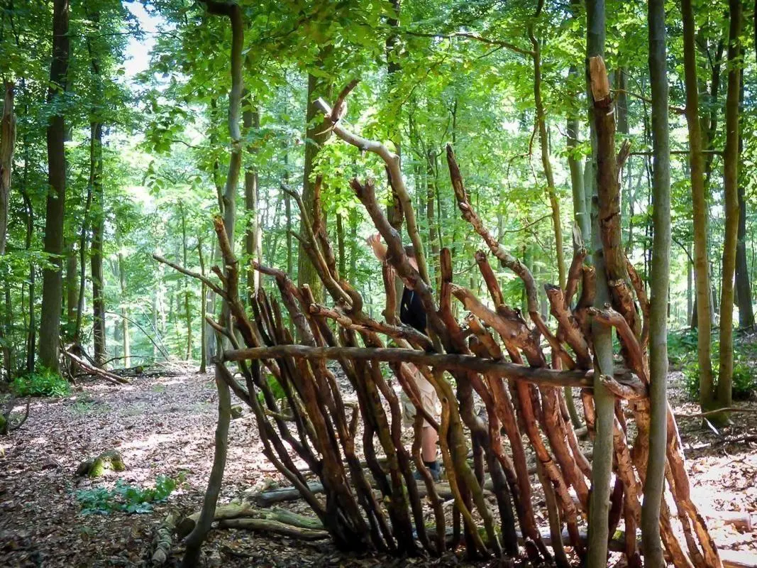 Selbstgebaute Laubhütte aus Ästen im Wald, umgeben von Laub und Bäumen