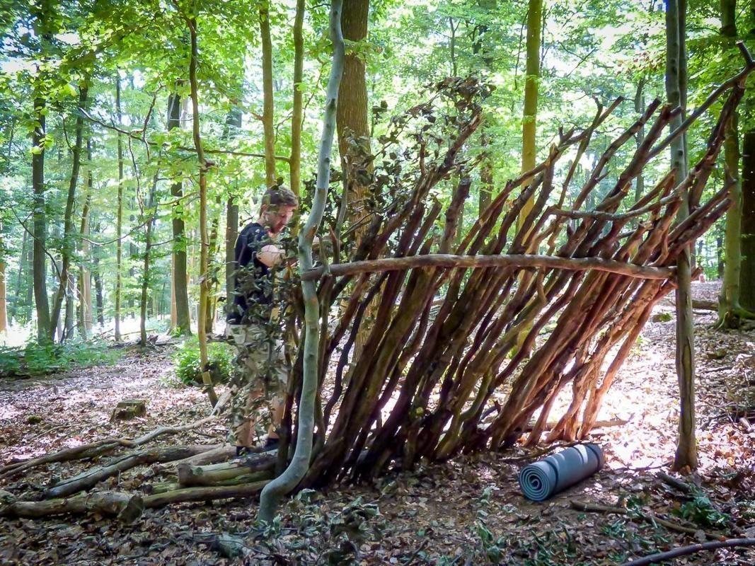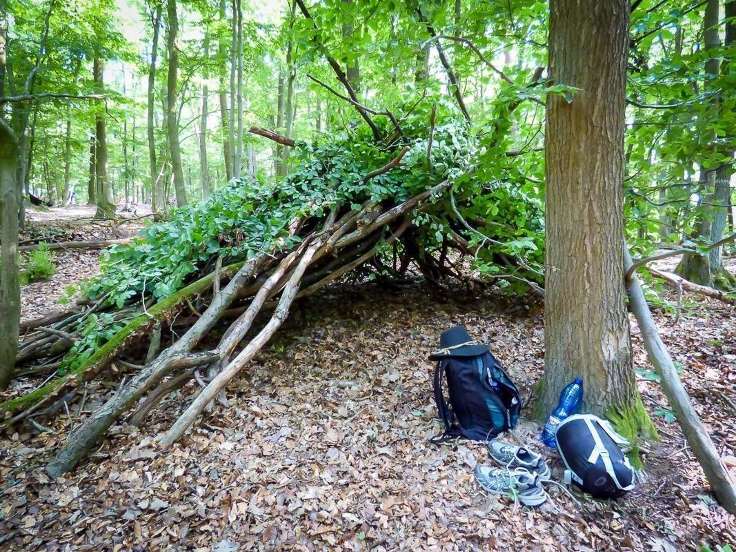 Biwak unter einem selbstgebauten Unterstand aus Ästen und Blättern