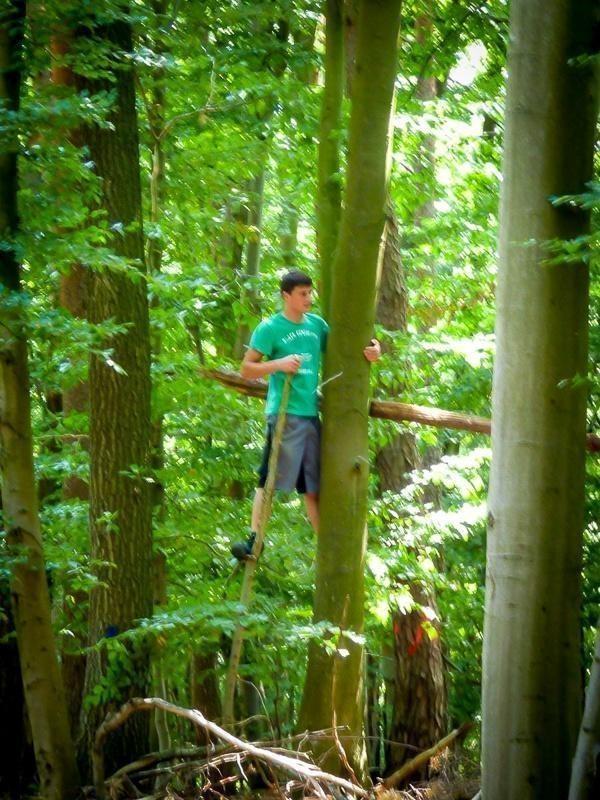 Selbstgebaute Plattform zwischen Bäumen mit Person, die darauf steht und einen Stock hält