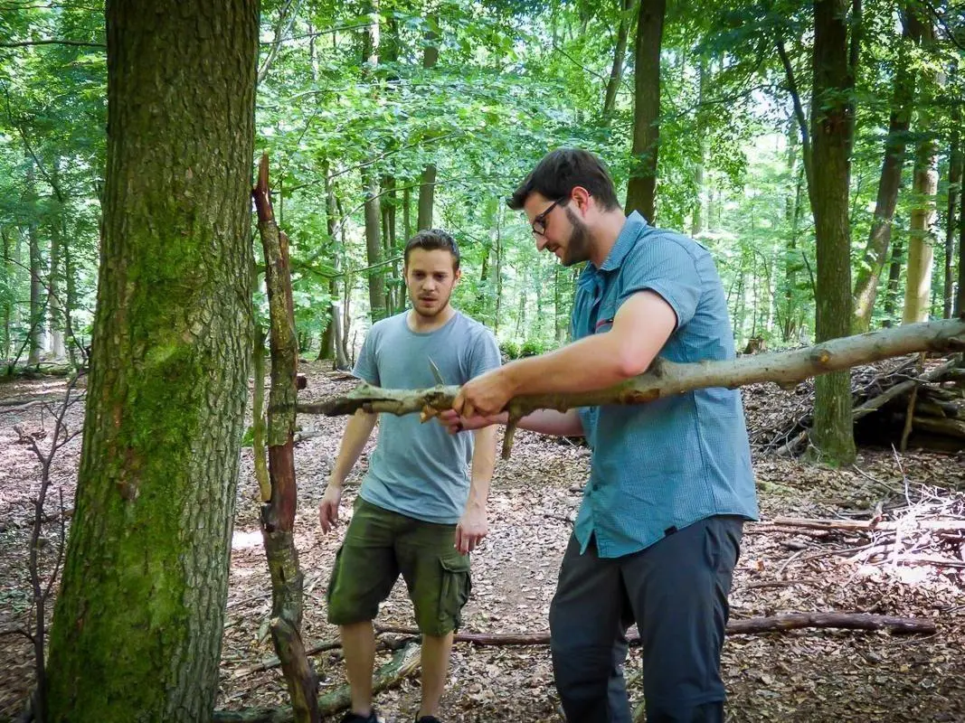 Drei Personen arbeiten an einer selbstgebauten Konstruktion aus zwei Holzstücken im Wald