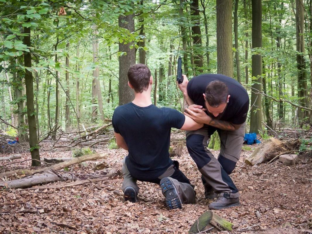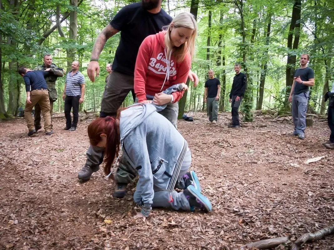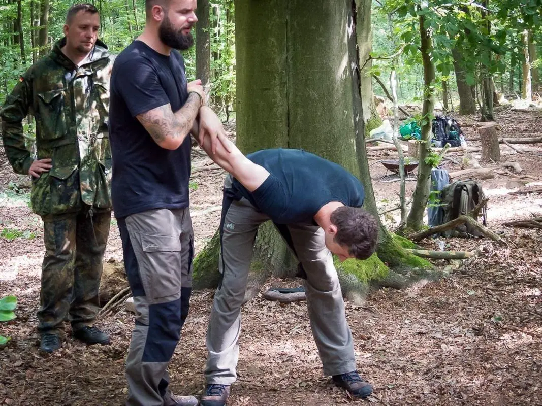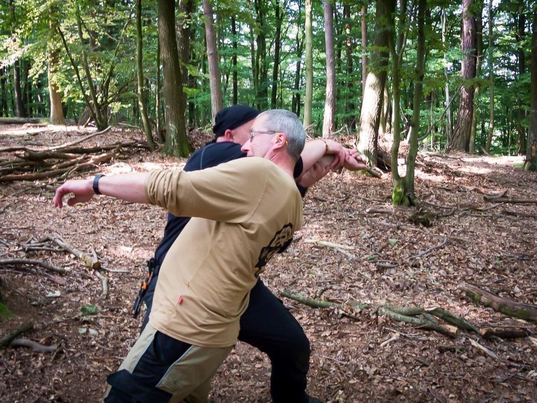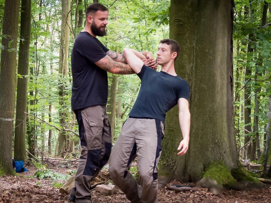 Ein Teilnehmer übt eine Technik zur Kontrolle eines anderen im Wald