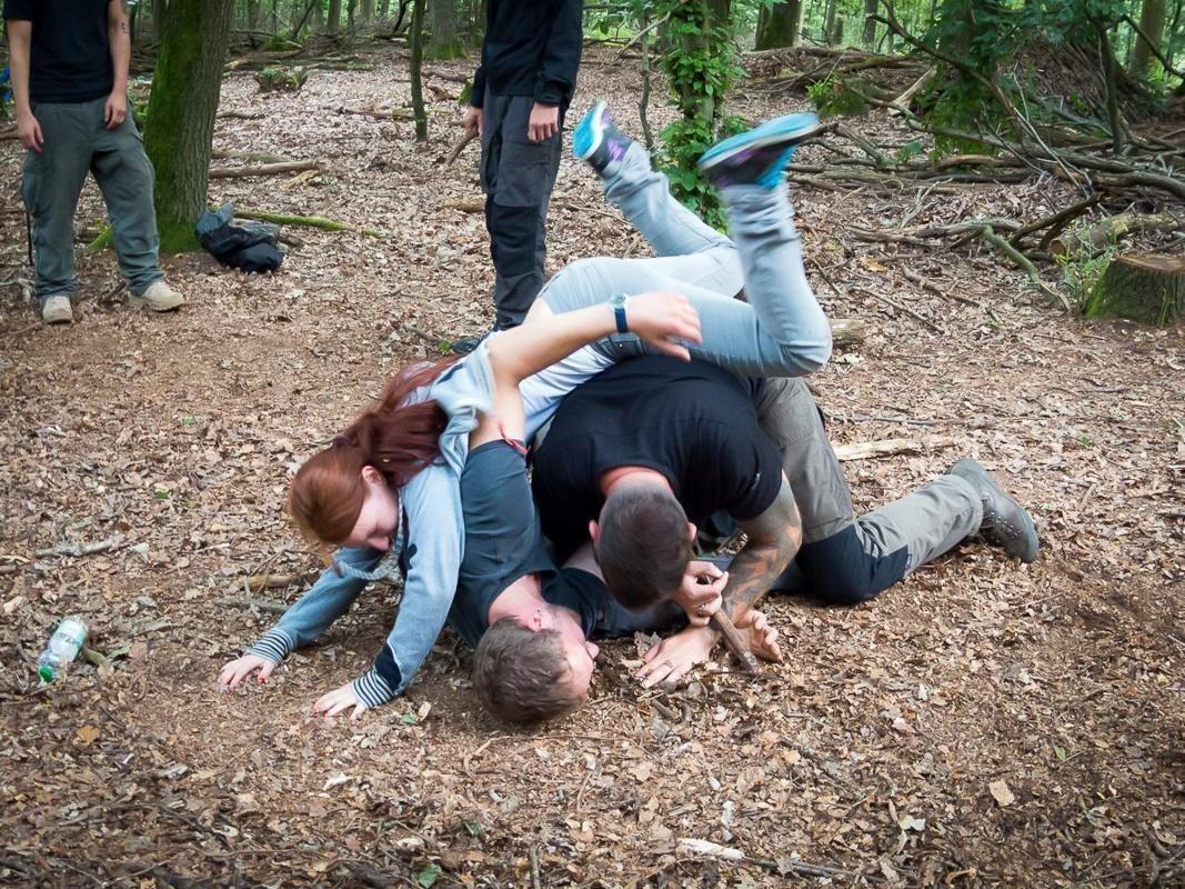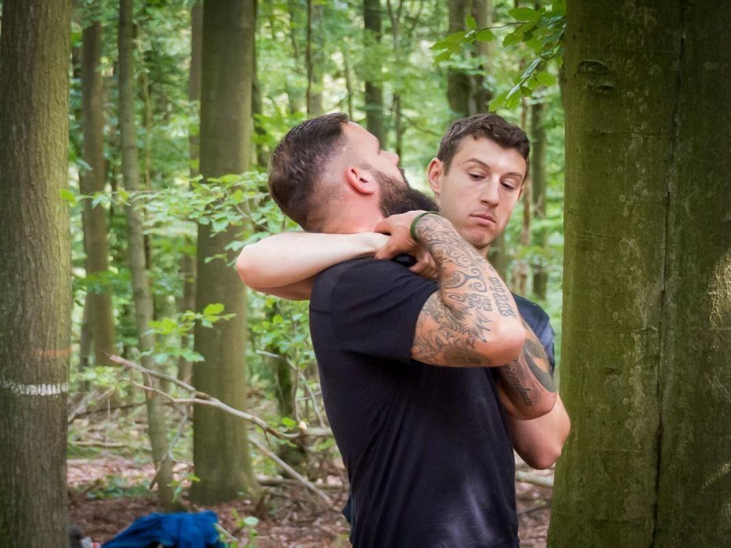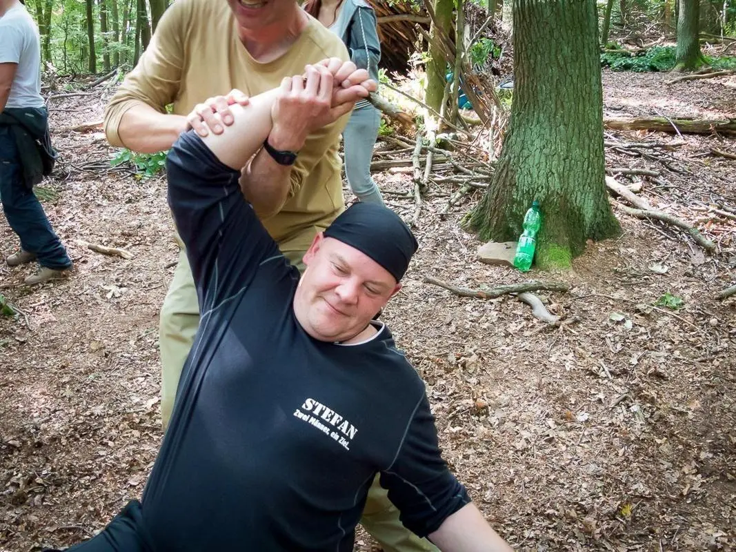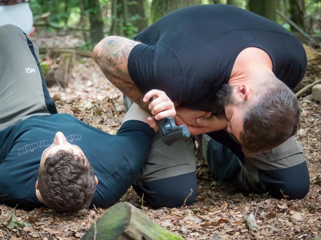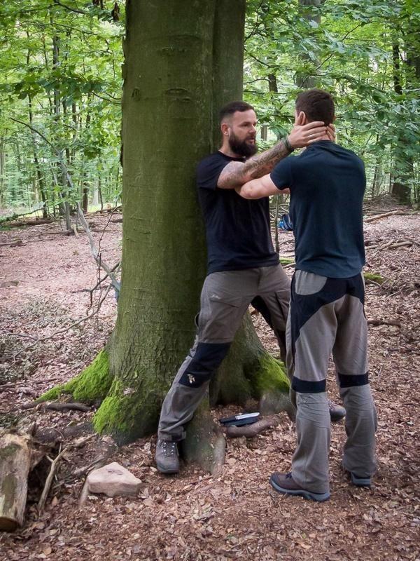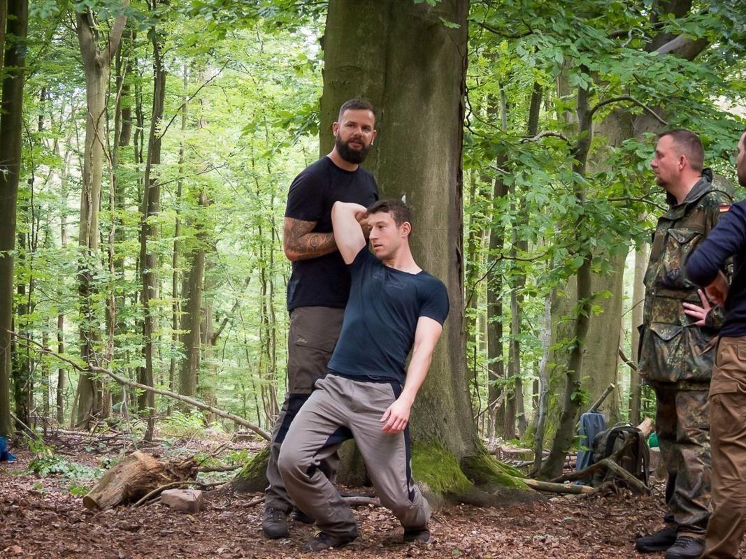 Ein Teilnehmer übt eine Technik zur Kontrolle eines anderen im Wald