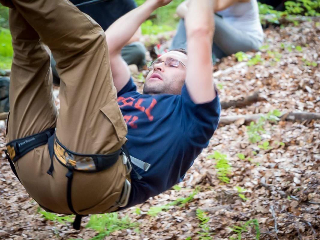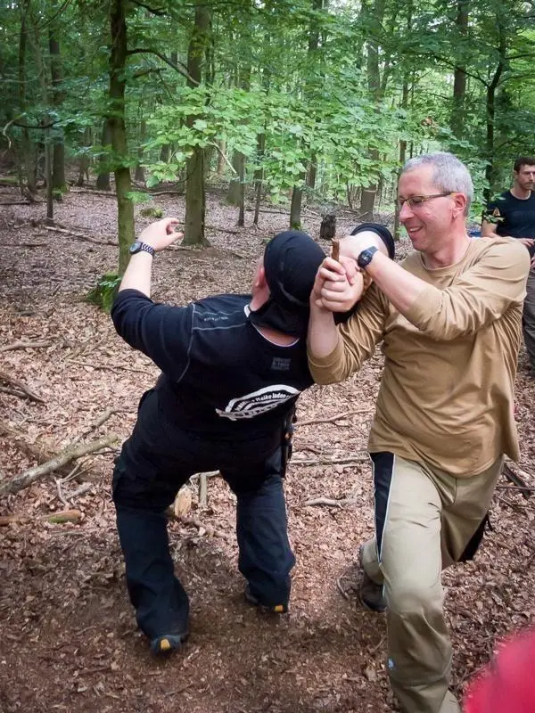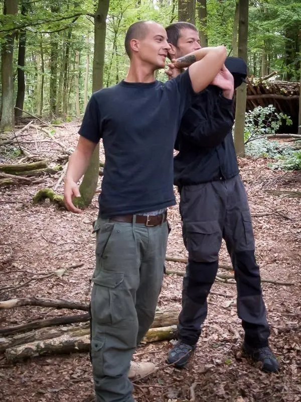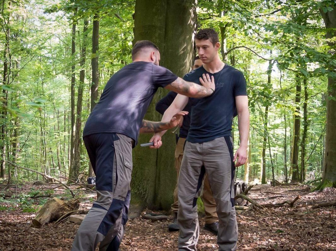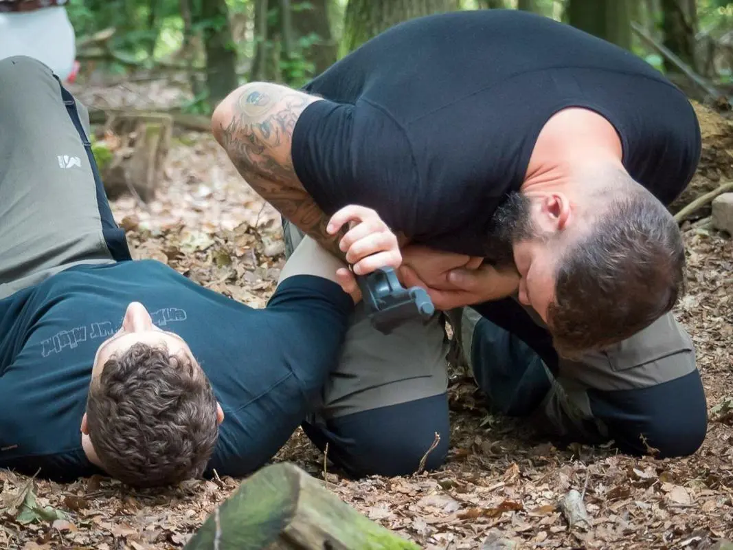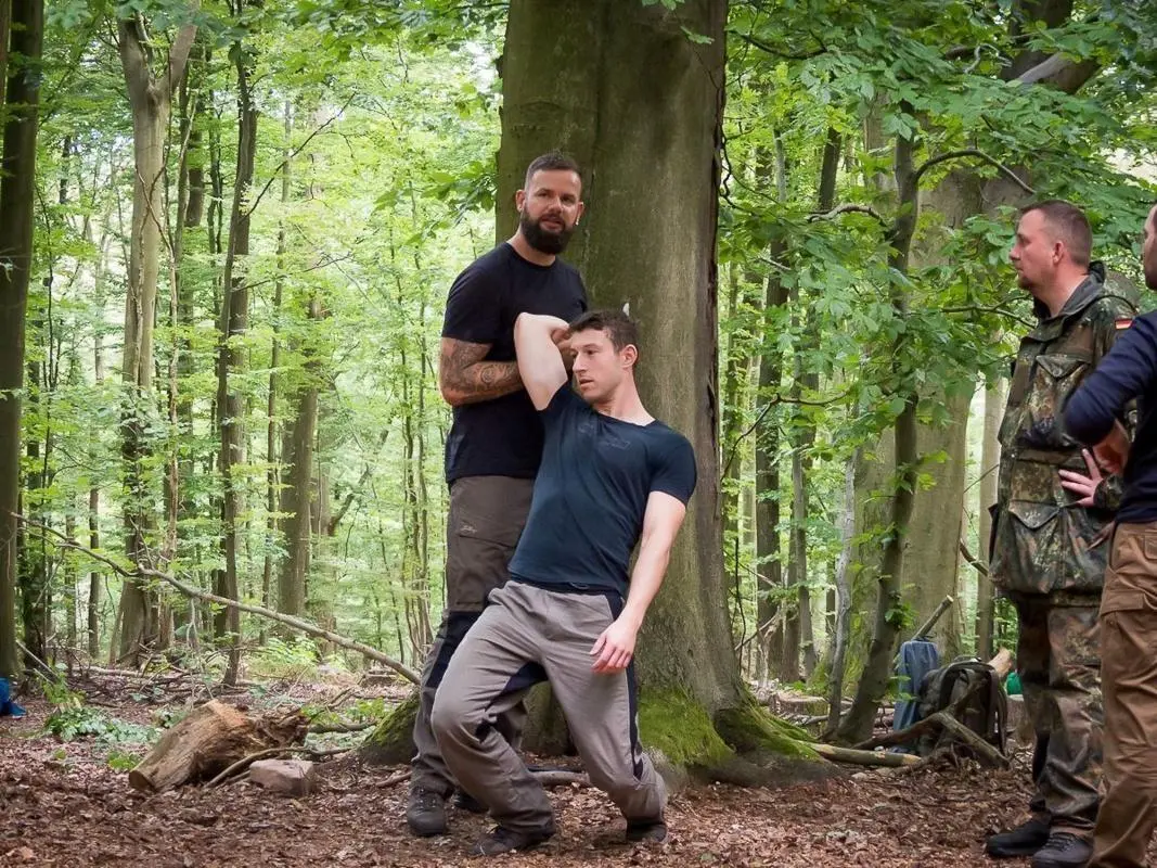 Ein Teilnehmer übt eine Technik zur Kontrolle eines anderen im Wald