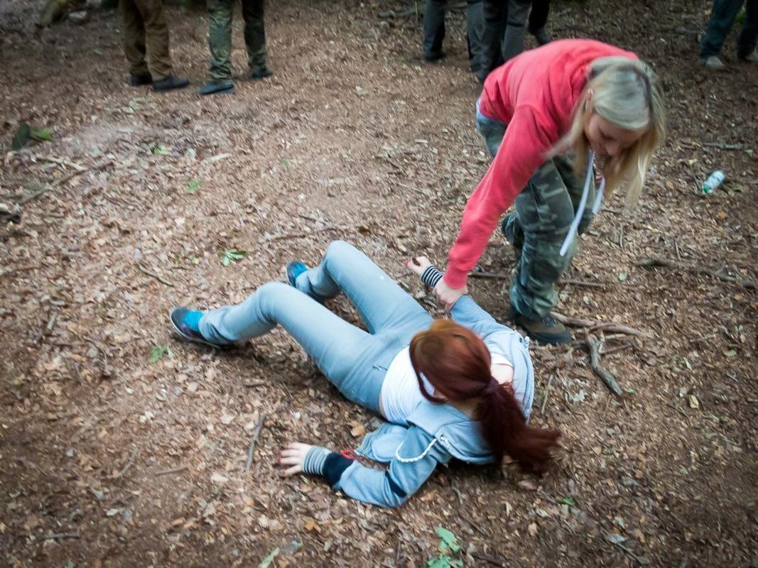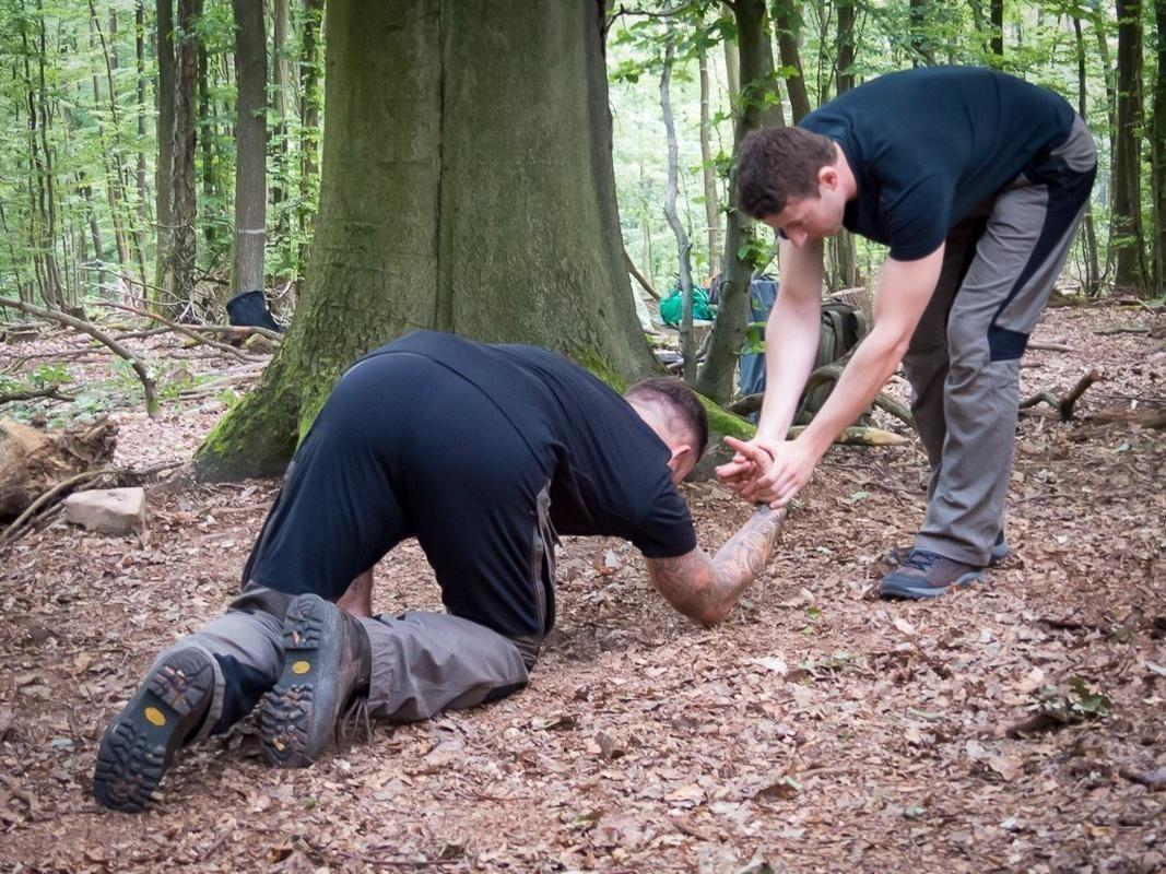 Zwei Personen üben eine Technik zur Handfesselung auf dem Boden im Wald