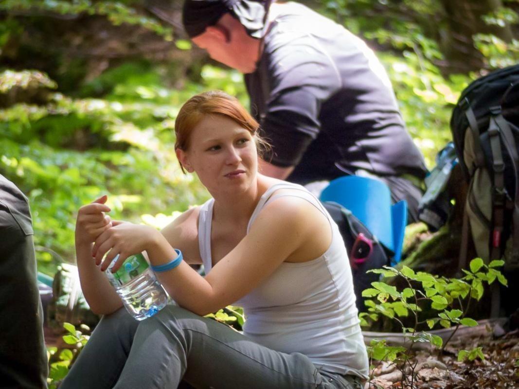 Eine Person sitzt im Wald und hält eine Wasserflasche in der Hand