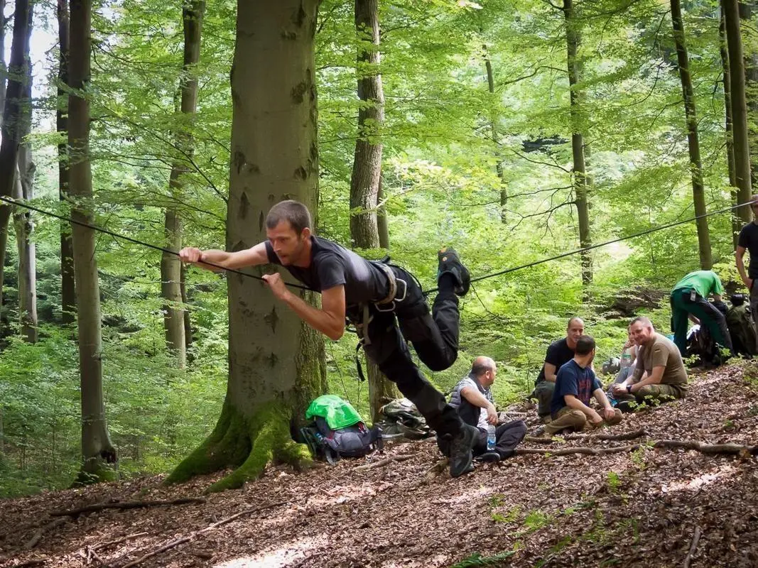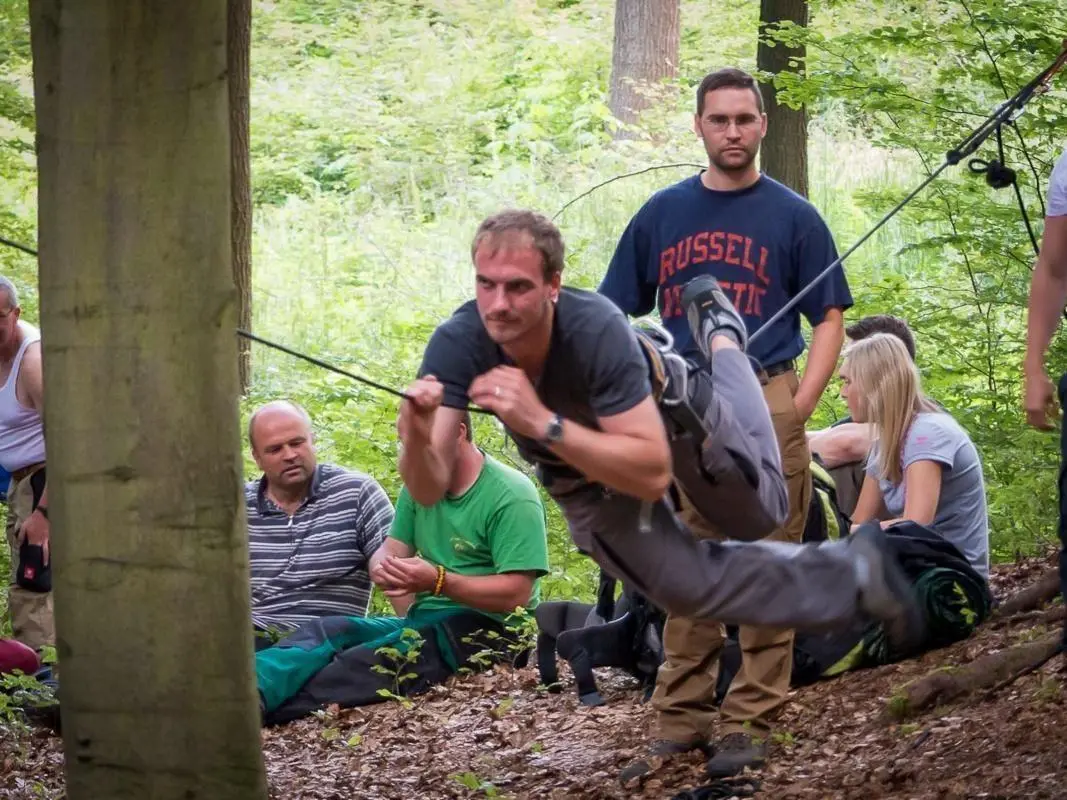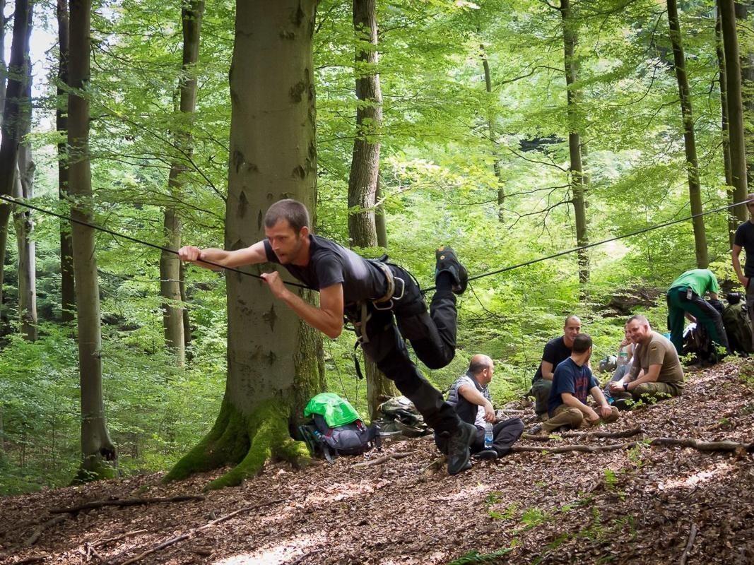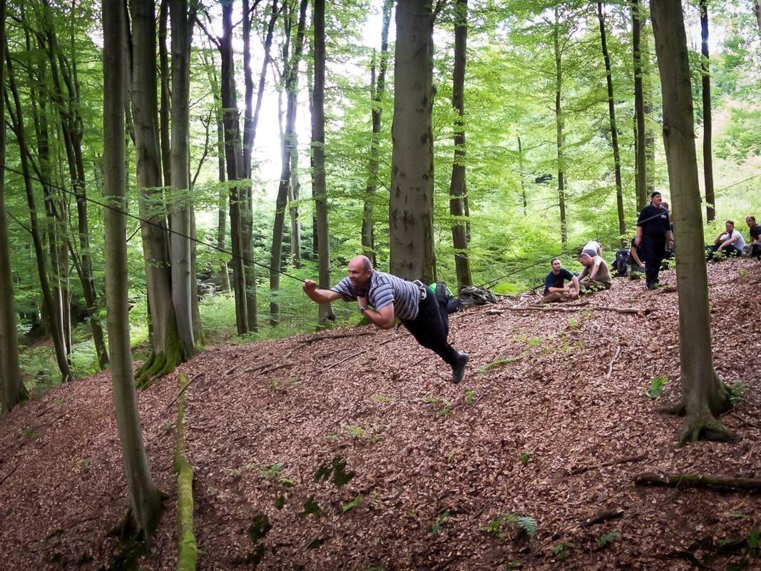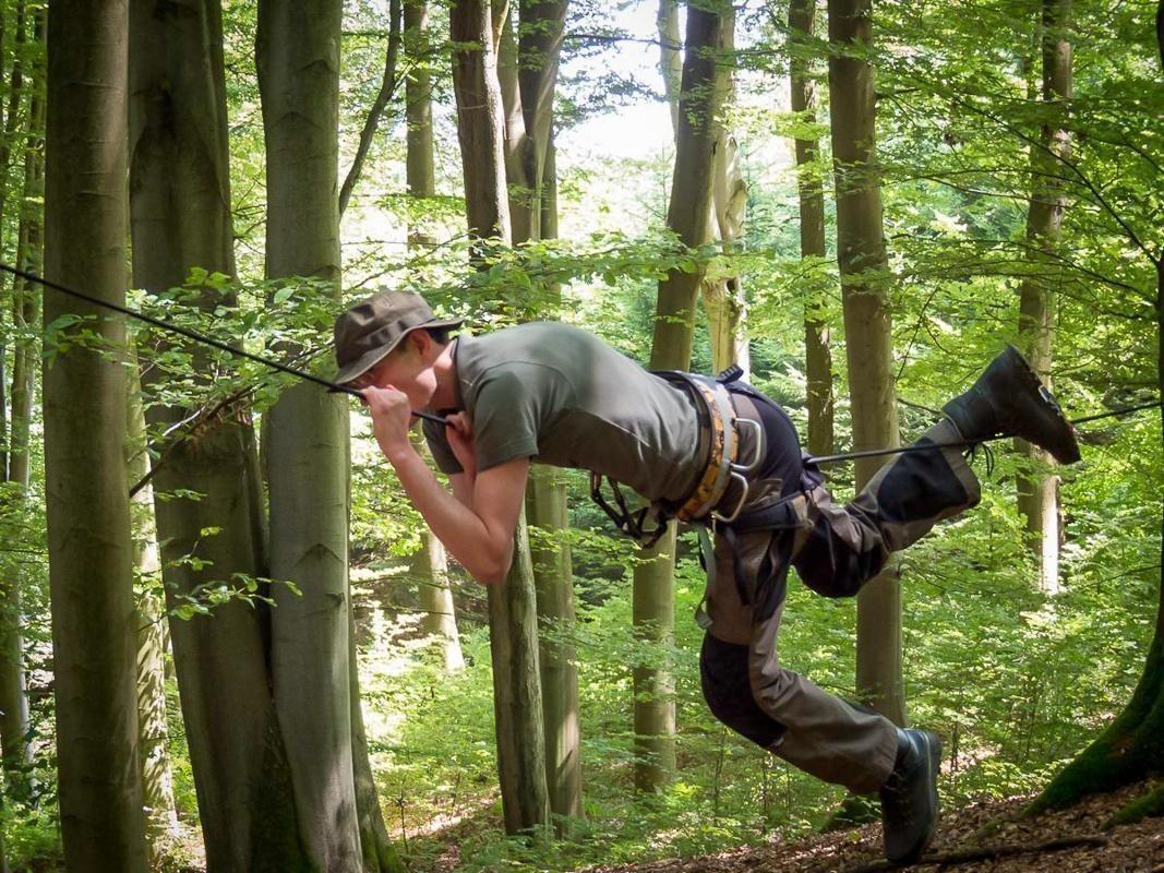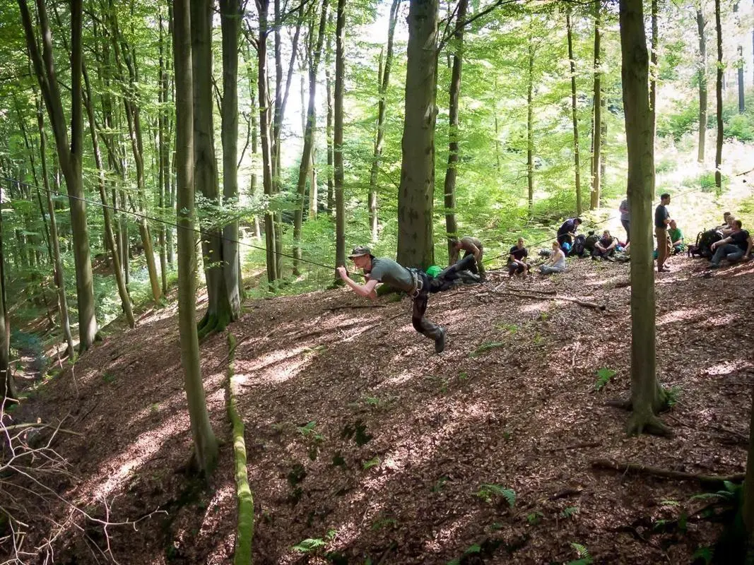 Teilnehmer üben eine Seilquerung mit einem Seil und Sicherheitsausrüstung im Wald