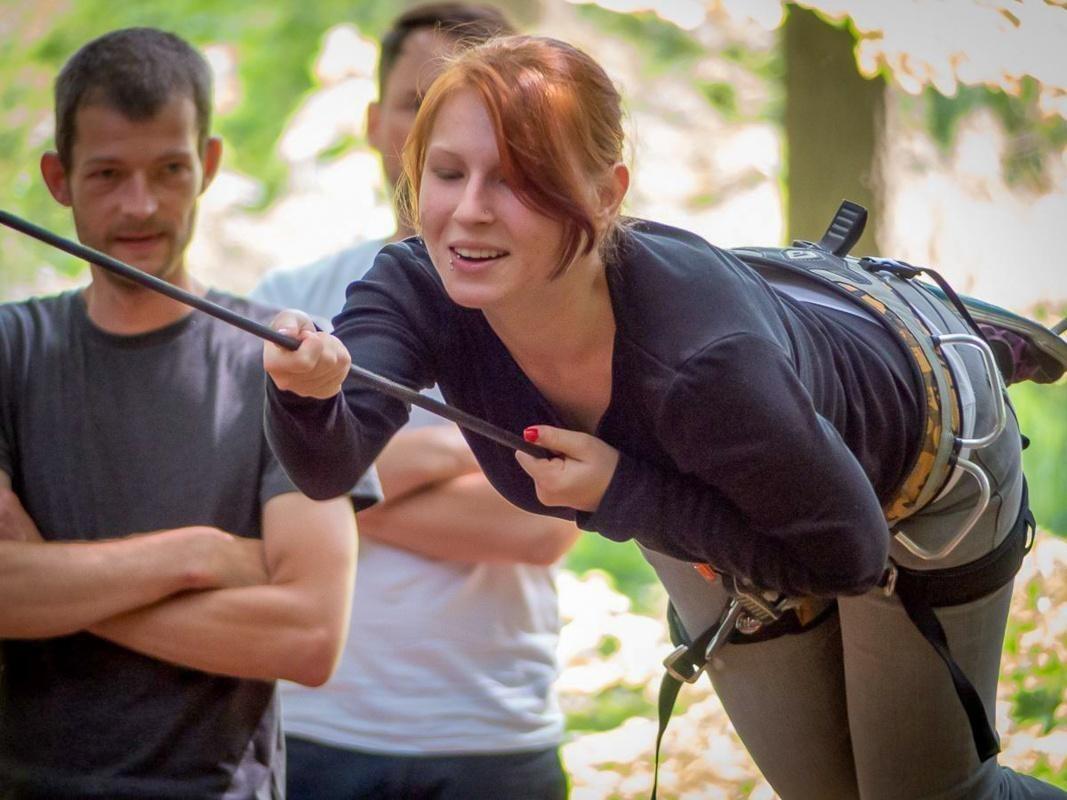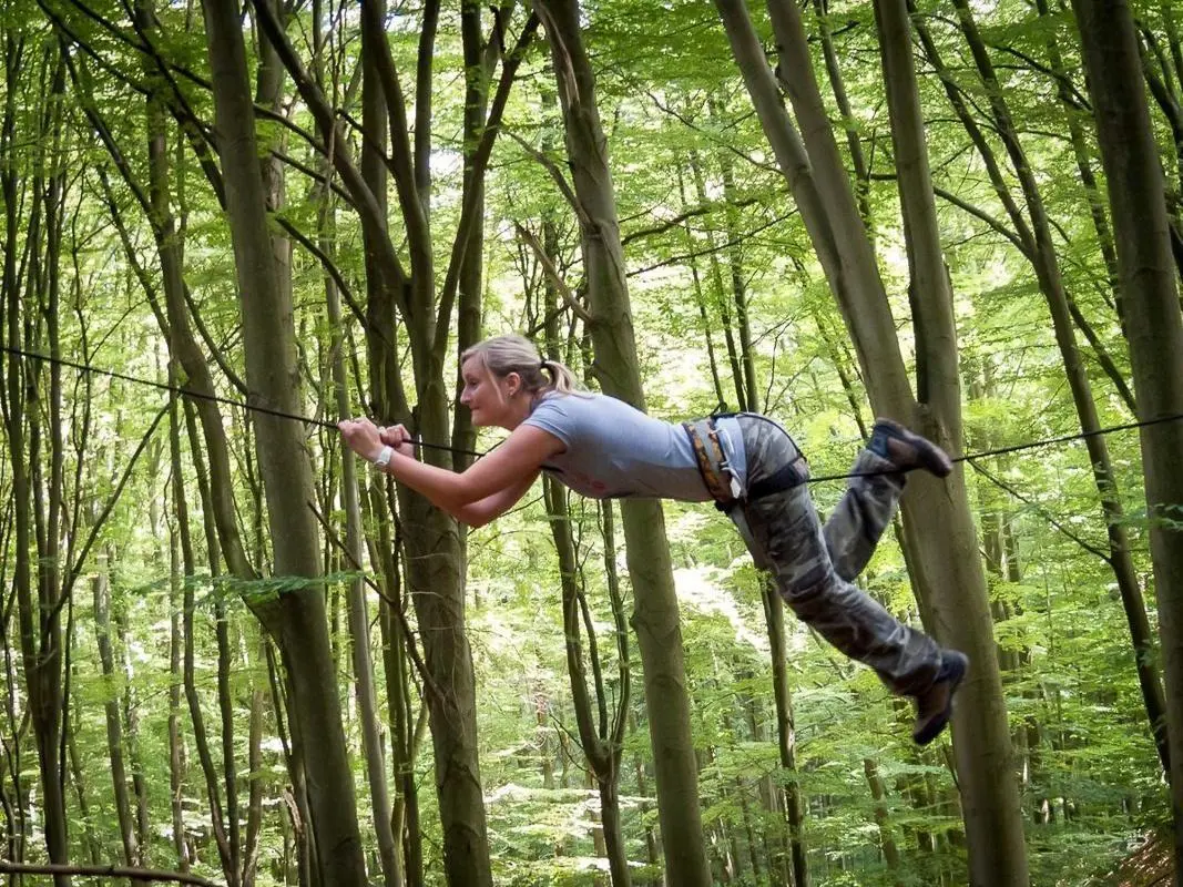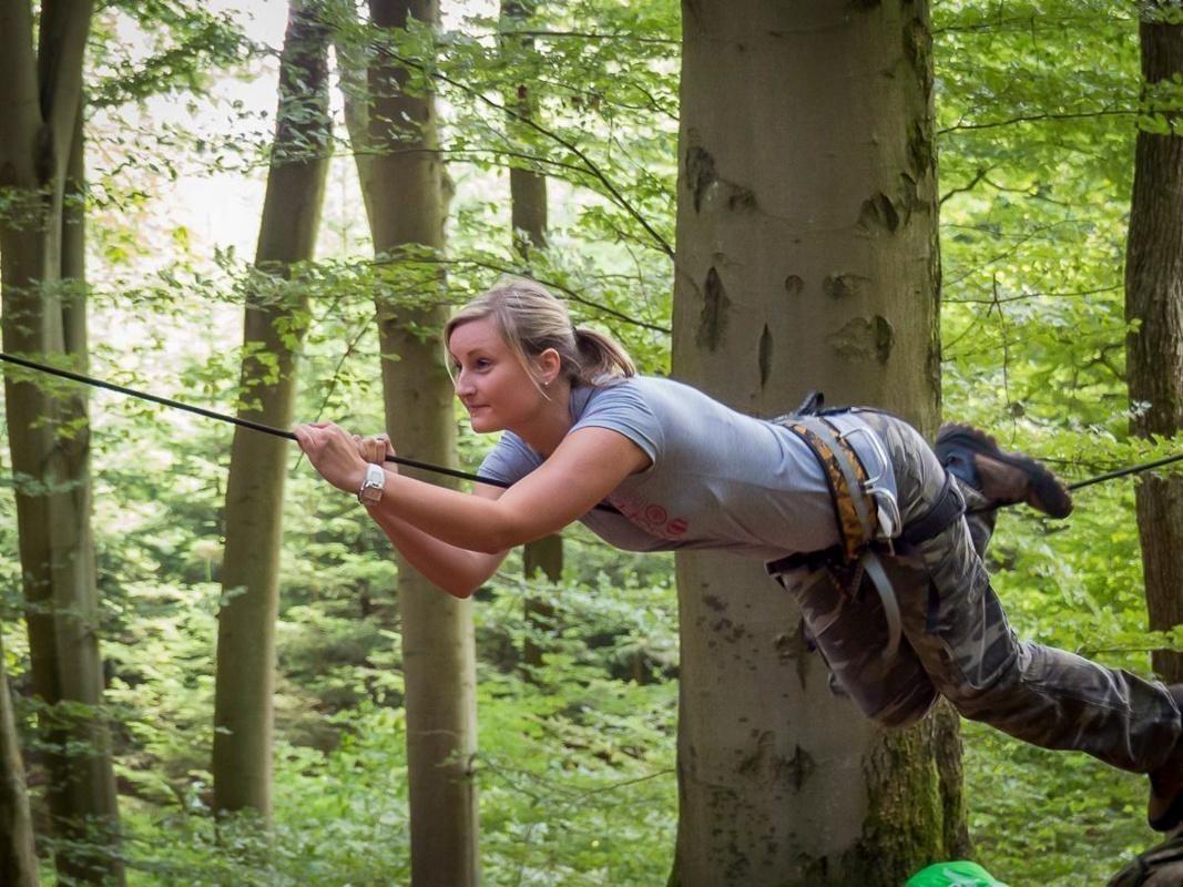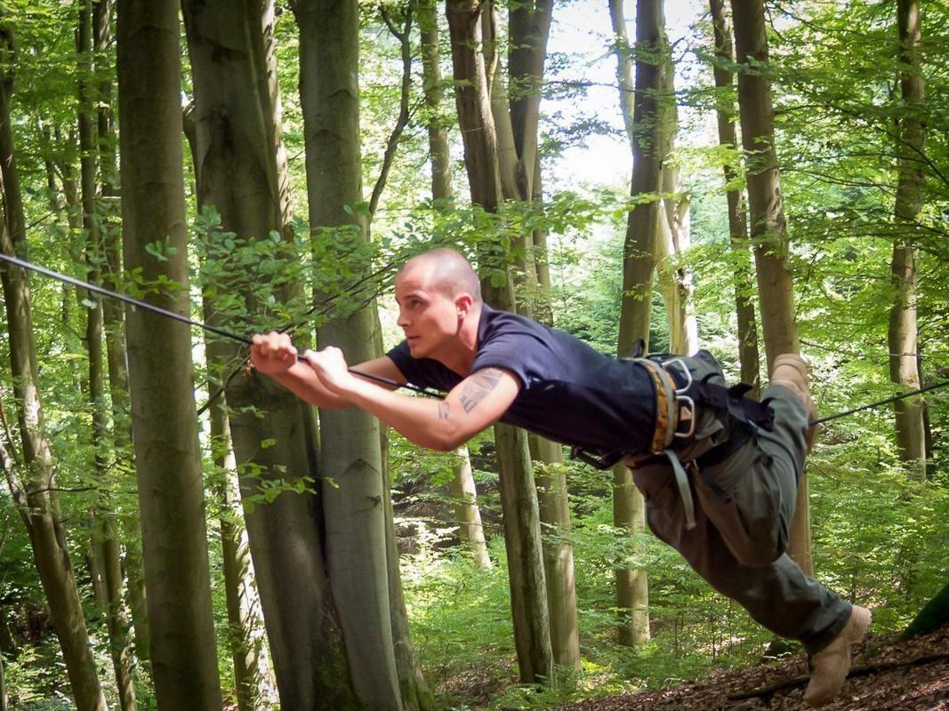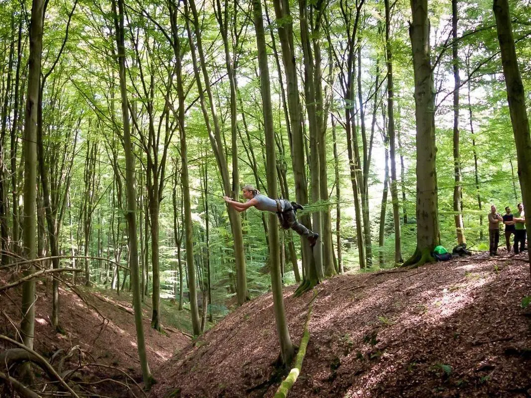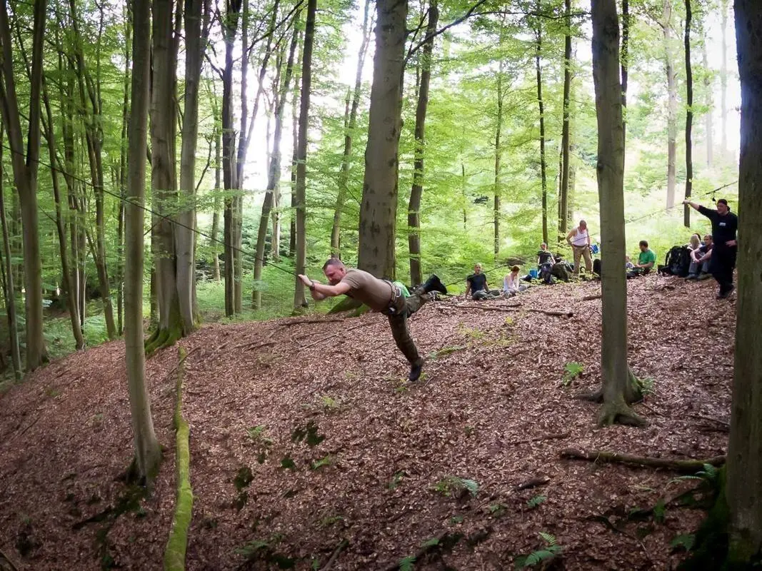 Teilnehmer üben eine Seilquerung mit einem Seil und Sicherheitsausrüstung im Wald
