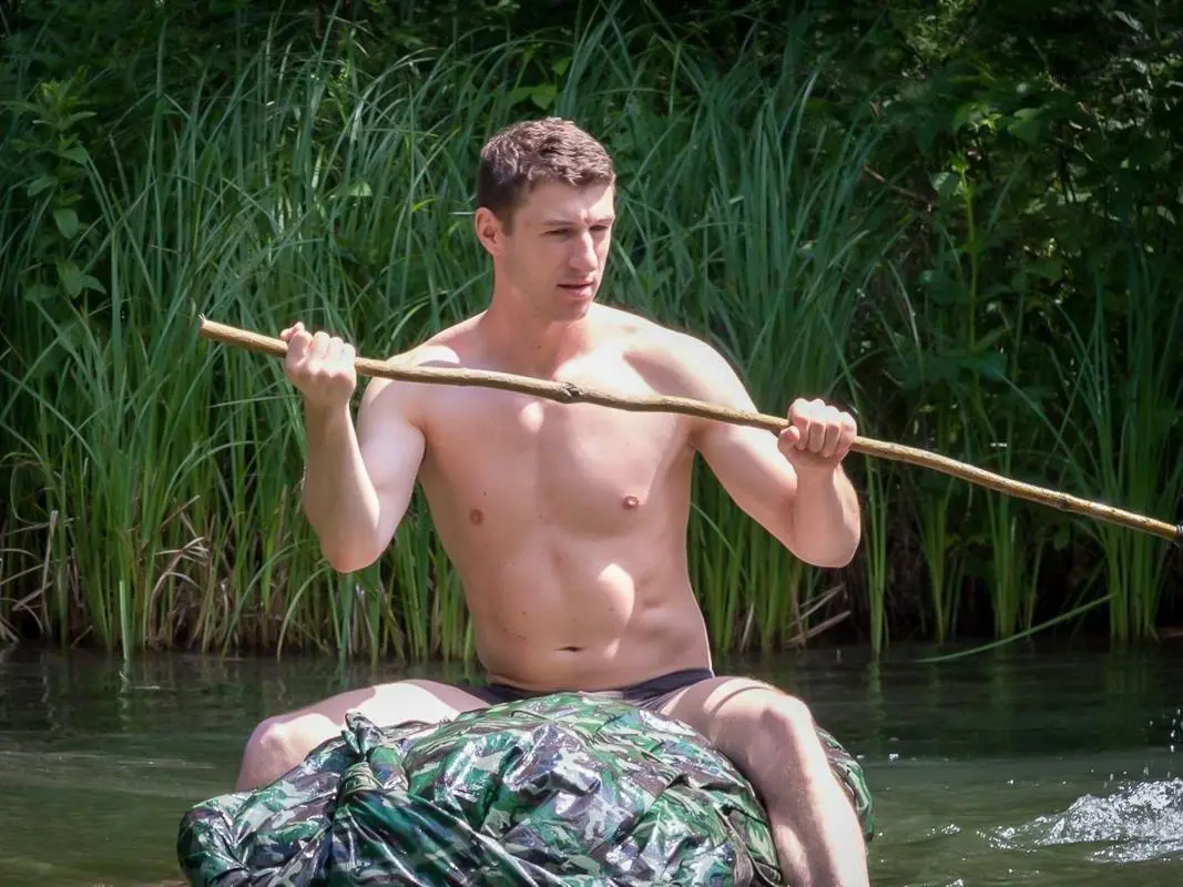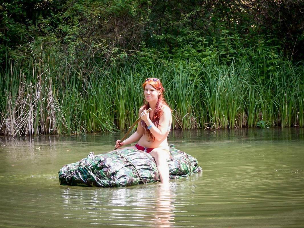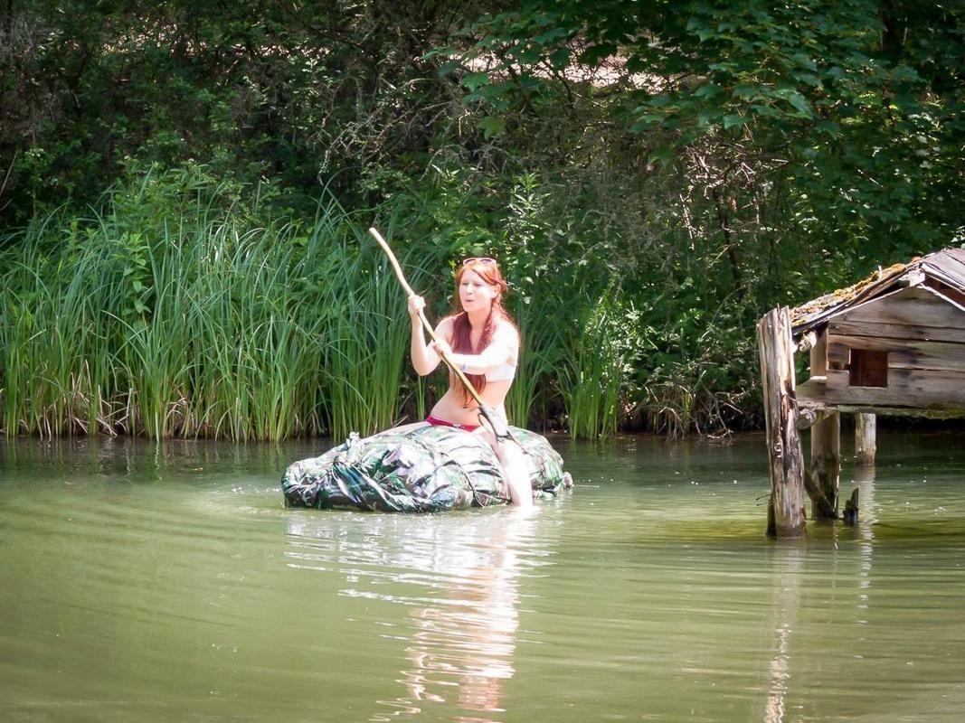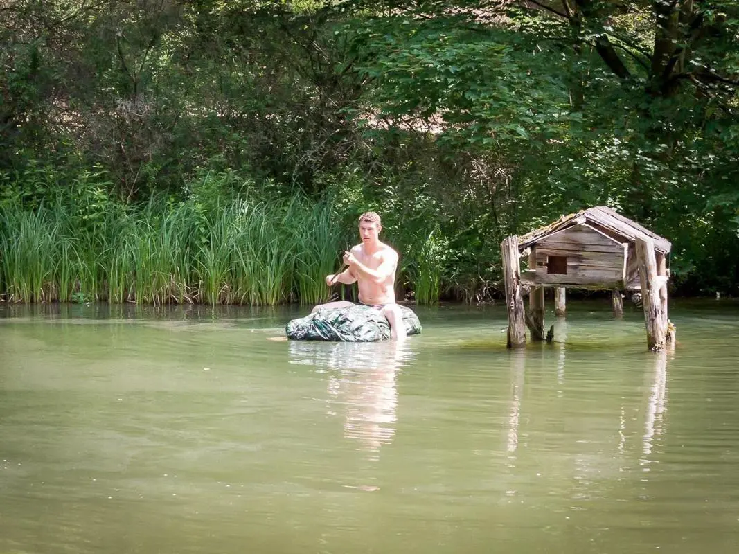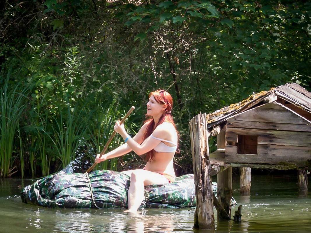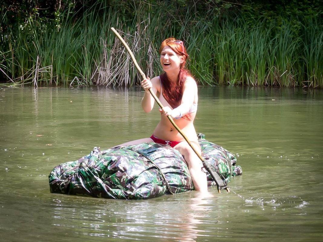 Frau sitzt auf einem camouflagefarbenen Floß und hält einen Stock in der Hand