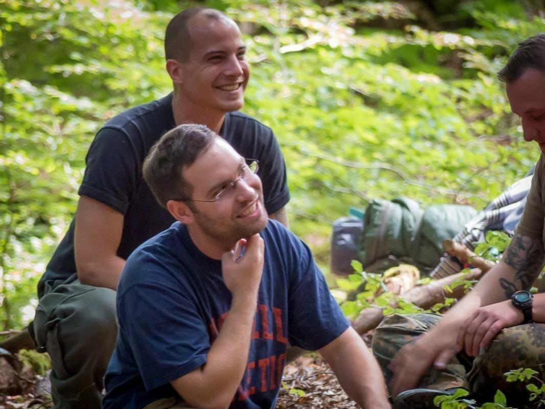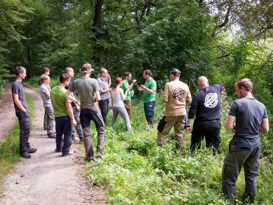 Gruppe diskutiert im Wald über Überlebenstechniken und Naturkenntnisse