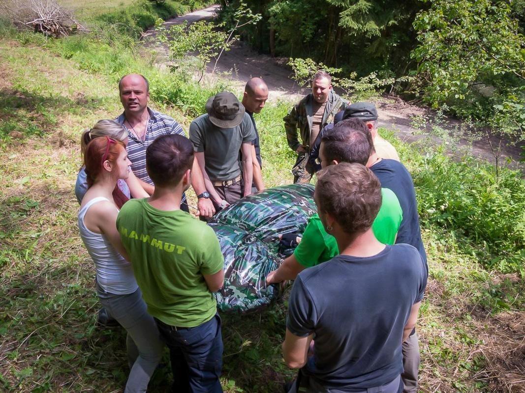 Gruppe arbeitet an einer improvisierten Trage aus einer grünen Plane im Freien