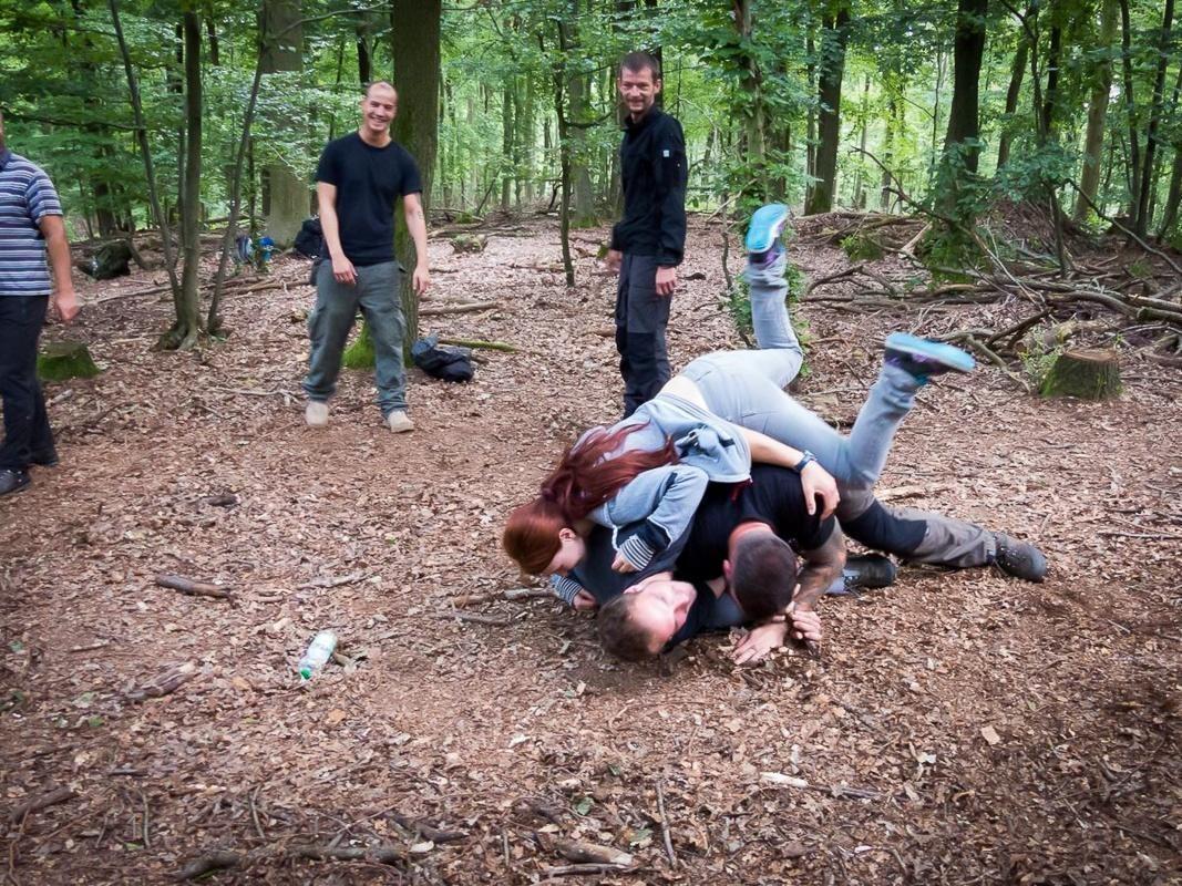 Zwei Personen üben eine Selbstverteidigungstechnik am Boden im Wald aus