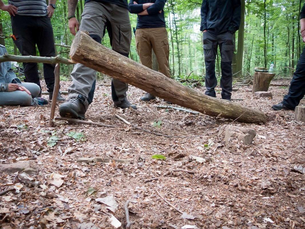 Gruppe arbeitet an einer Holzhebel-Konstruktion im Wald