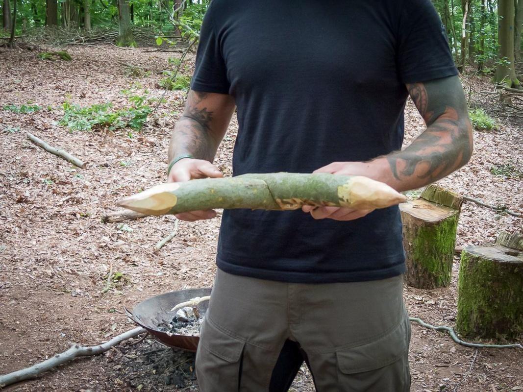 Holzstück mit abgeschälten Enden wird gehalten, im Hintergrund Feuerstelle sichtbar