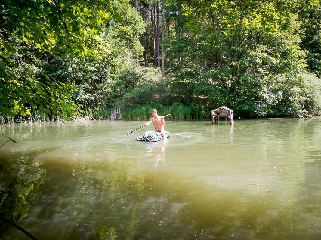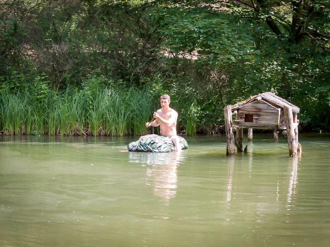 Frau sitzt auf einem camouflagefarbenen Schwimmobjekt im Wasser und hält einen Stock