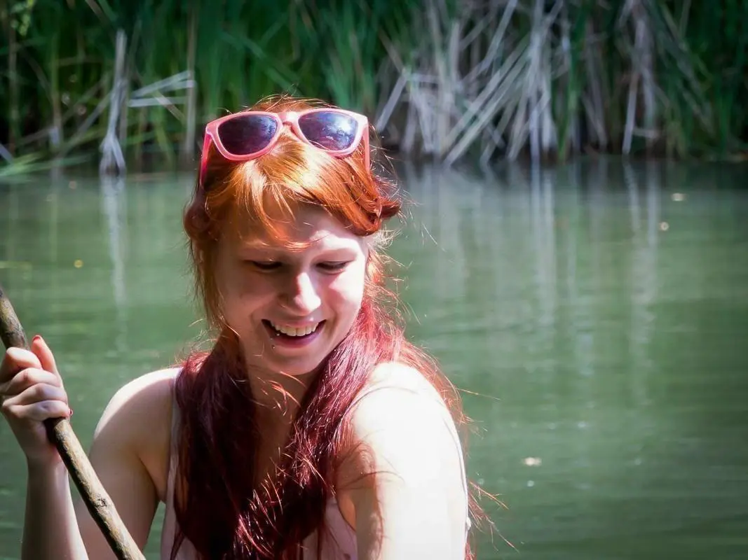 Lächelnde Person hält einen Stock am Ufer eines Gewässers