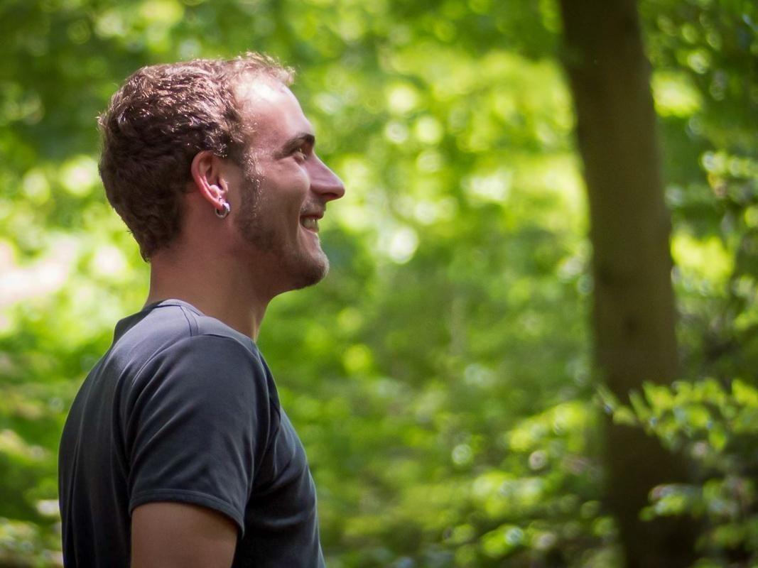 Lichtdurchfluteter Wald mit einer Person, die lächelt und nach oben schaut