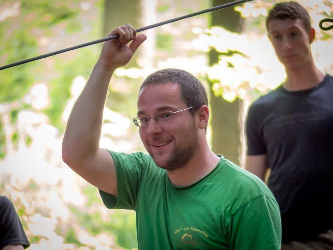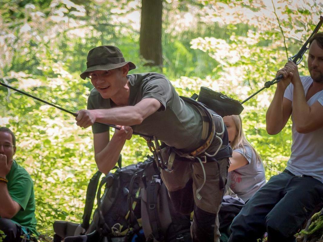Teilnehmer überquert selbstgebaute Seilbrücke zwischen zwei Bäumen