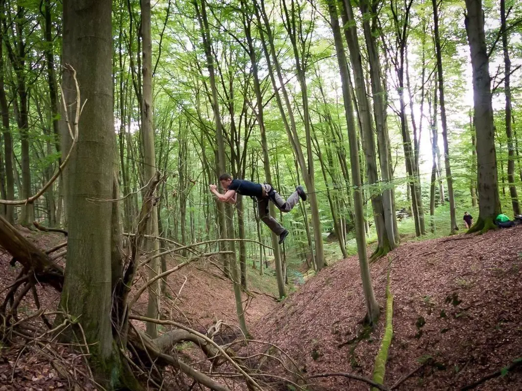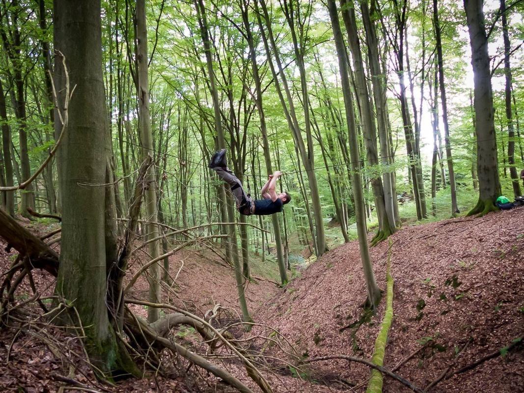 Person nutzt selbstgebaute Seilquerung zwischen Bäumen im Wald