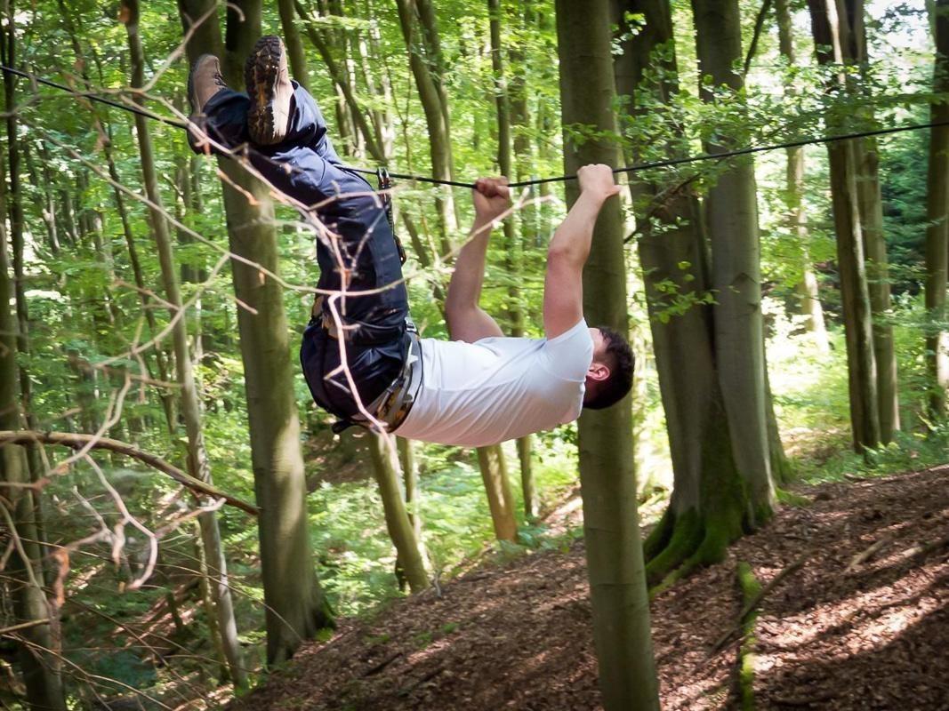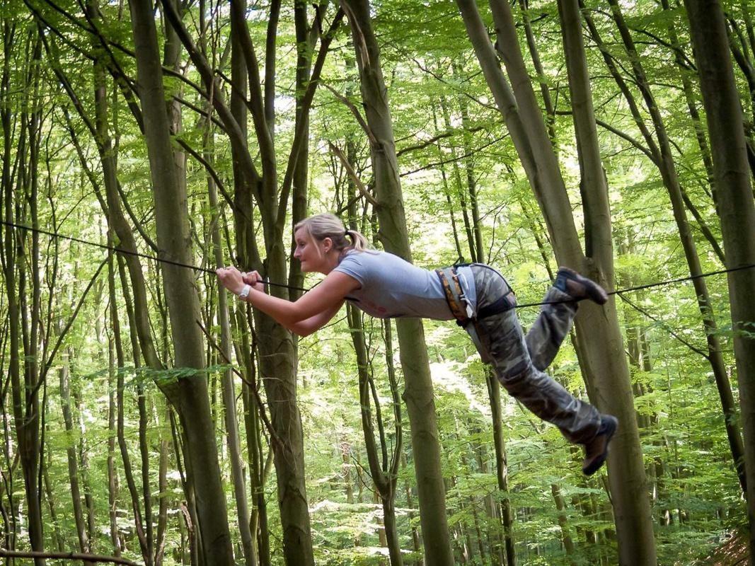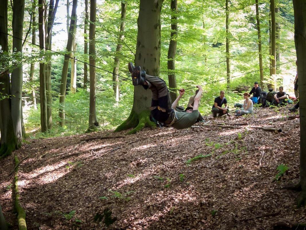 Selbstgebaute Seilquerung zwischen Bäumen wird überquert