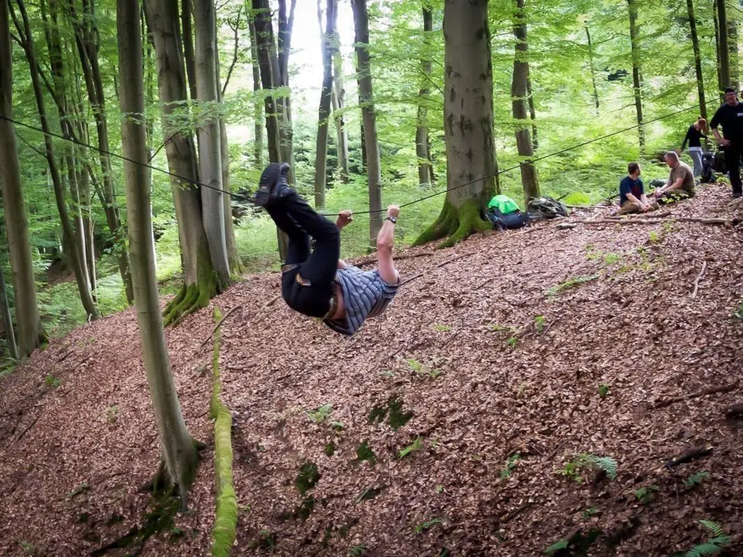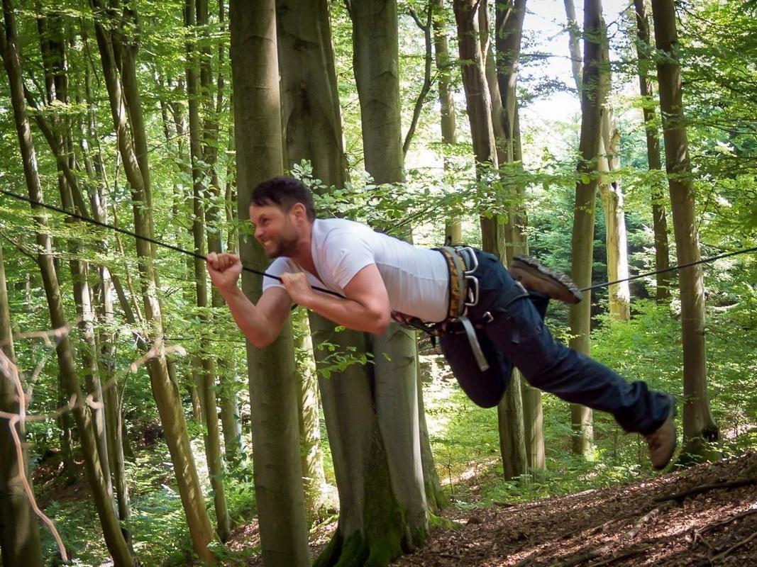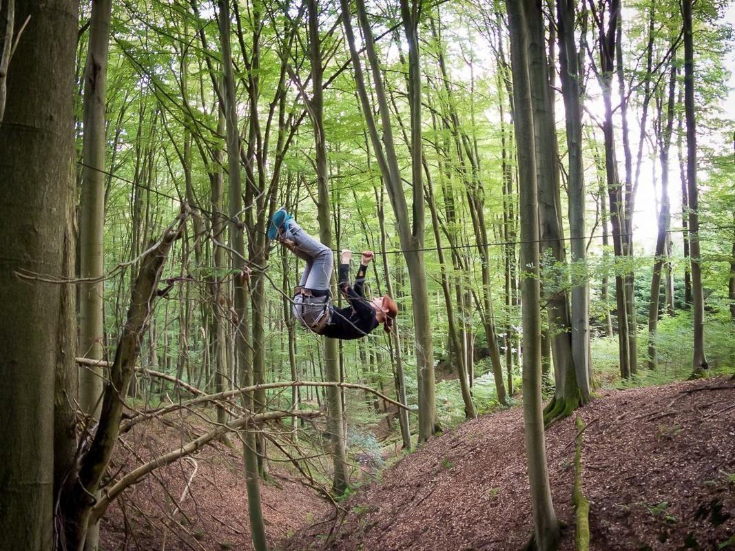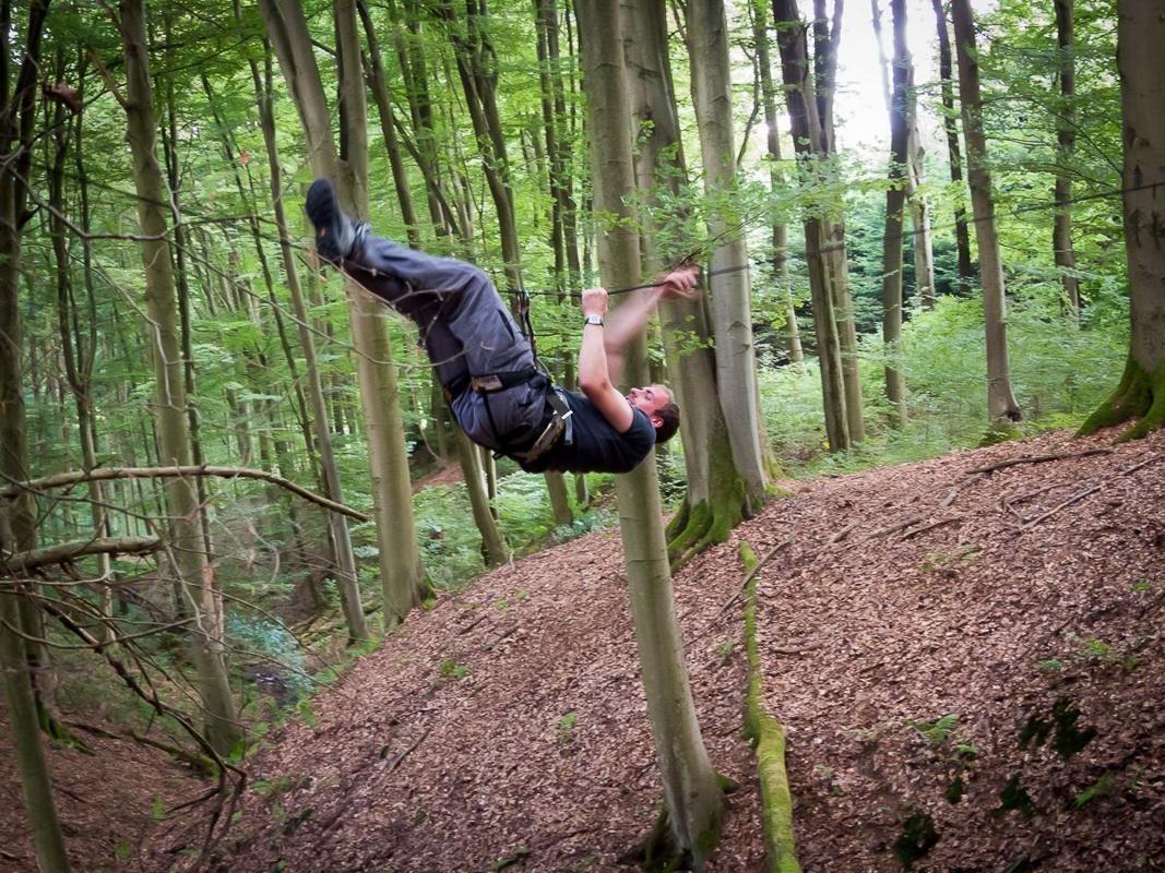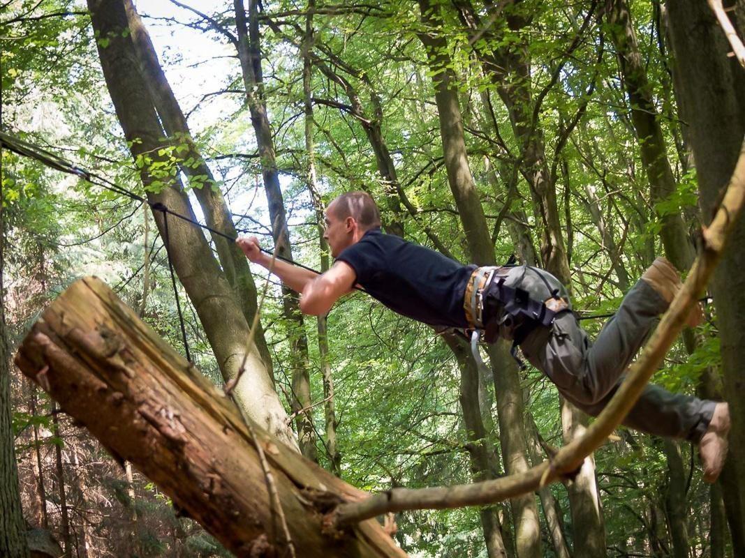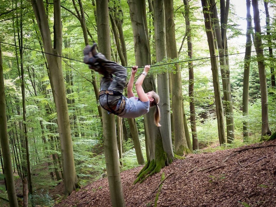 Seilquerung zwischen Bäumen mit gesichertem Klettergurt und Seil