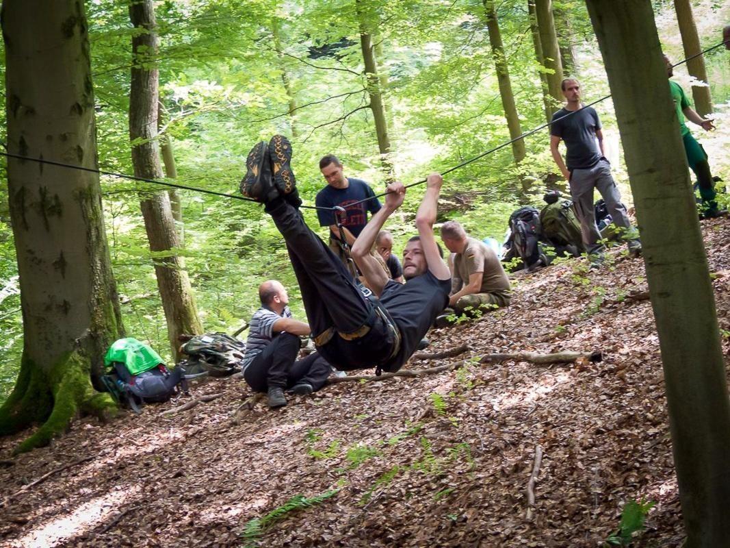 Selbstgebaute Seilquerung wird von einem Teilnehmer überquert