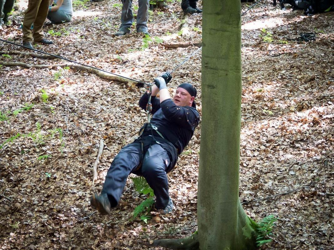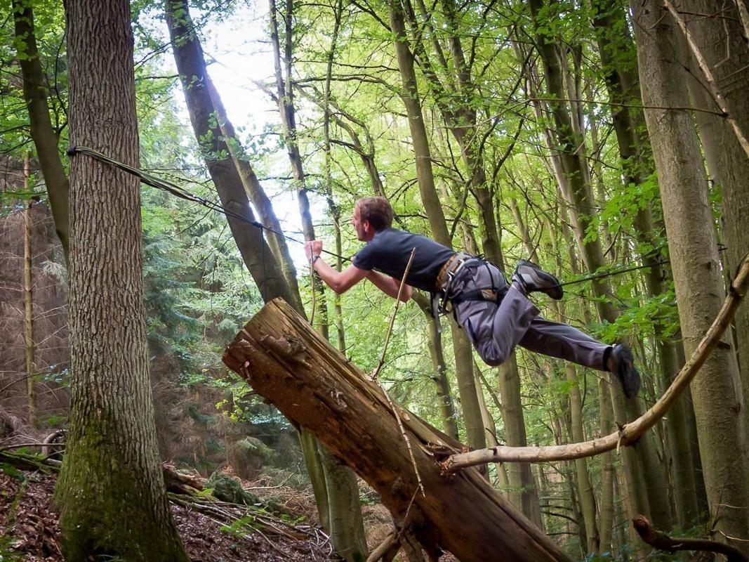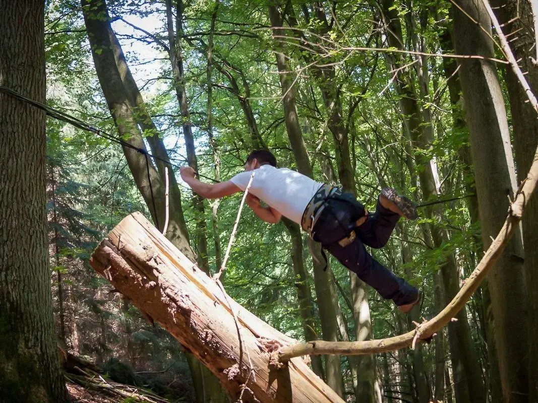 Seilquerung an einem Baumstamm im Wald mit gesichertem Teilnehmer