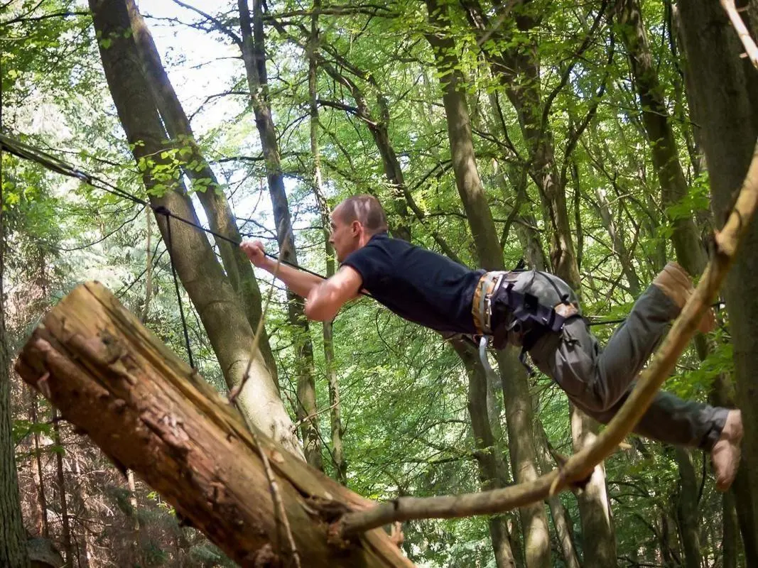 Mann überquert mit einem Karabiner eine selbstgebaute Seilbrücke im Wald