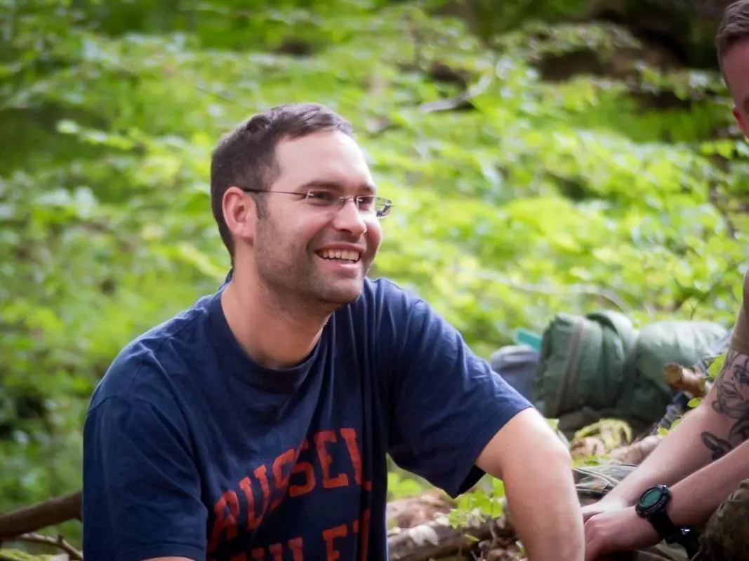 Gruppendynamik im Wald, eine Person kniet am Boden, andere helfen