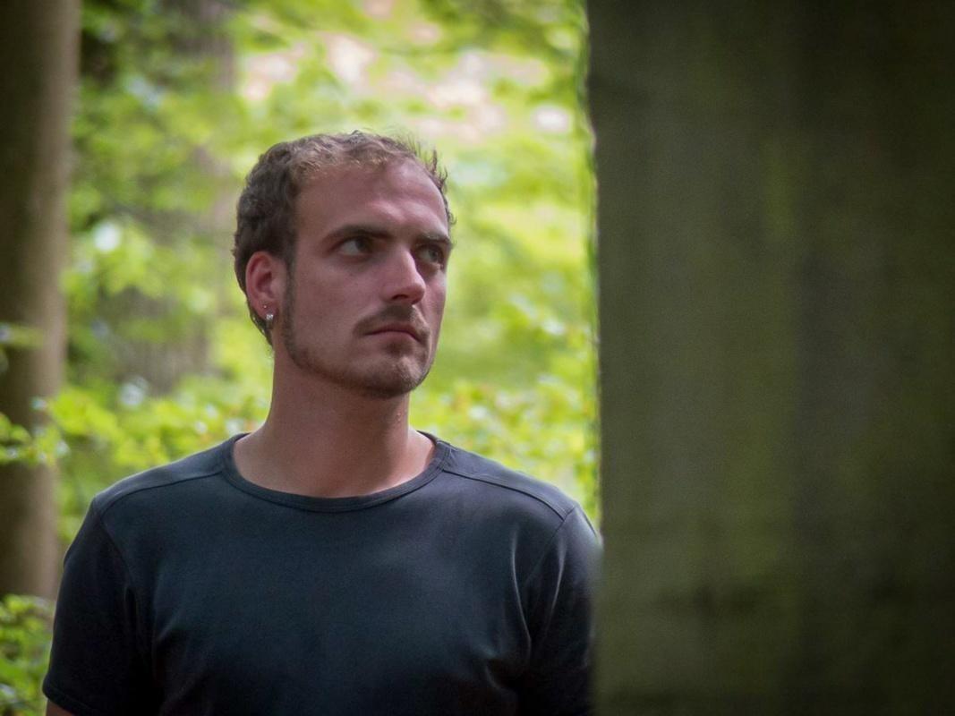 Person sitzt im Wald neben einem Rucksack und schaut nachdenklich