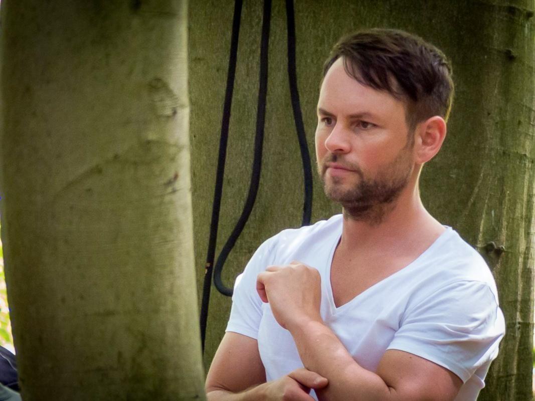 Zwei Personen stehen an einem Baum und üben eine Technik zur Selbstverteidigung