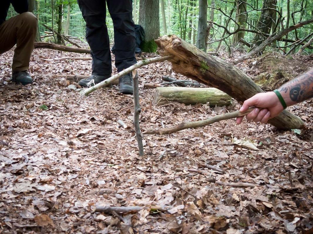Gruppe diskutiert um selbstgebaute Schlagfalle im Wald