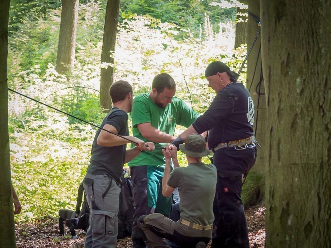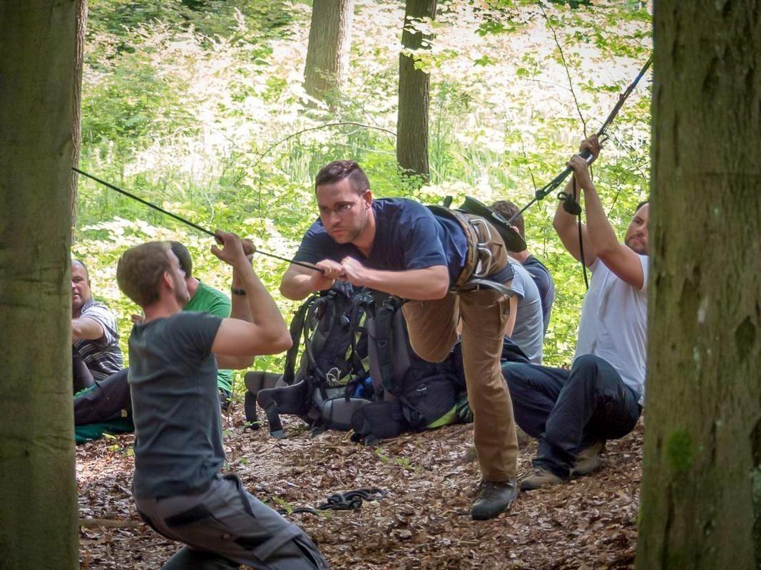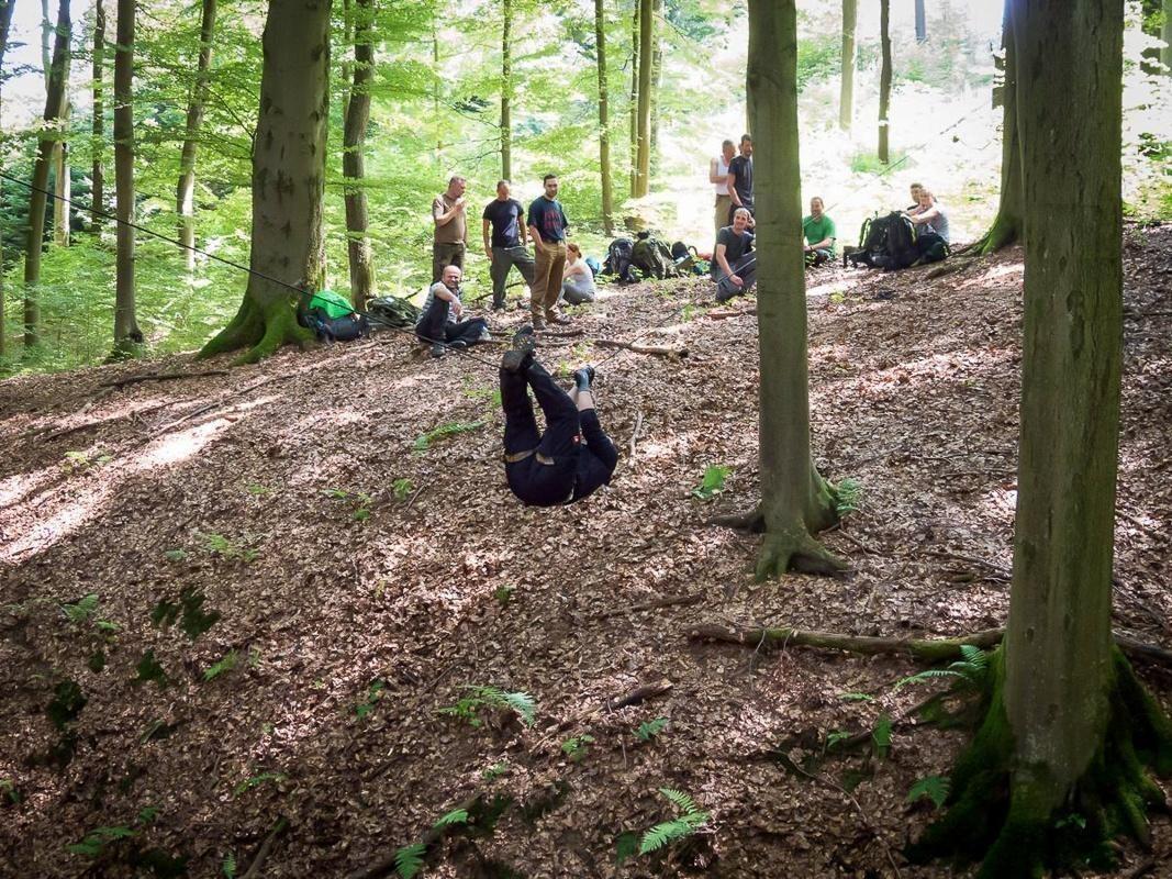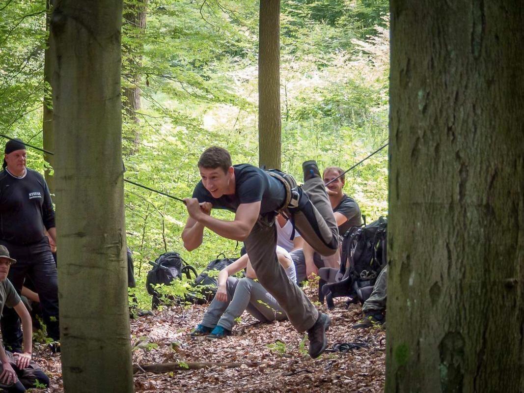 Gruppierung arbeitet gemeinsam an einer selbstgebauten Seilquerung im Wald