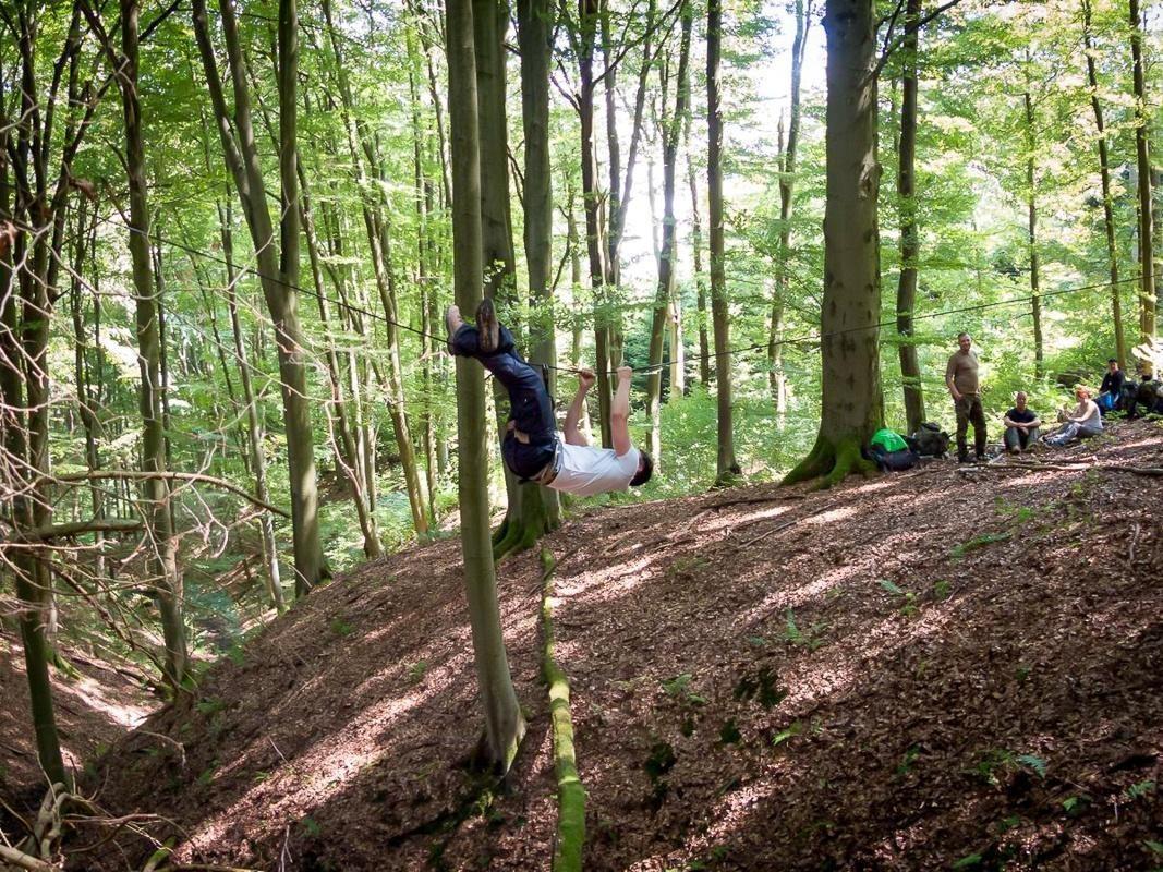Selbstgebaute Seilquerung zwischen Bäumen wird von einer Person genutzt