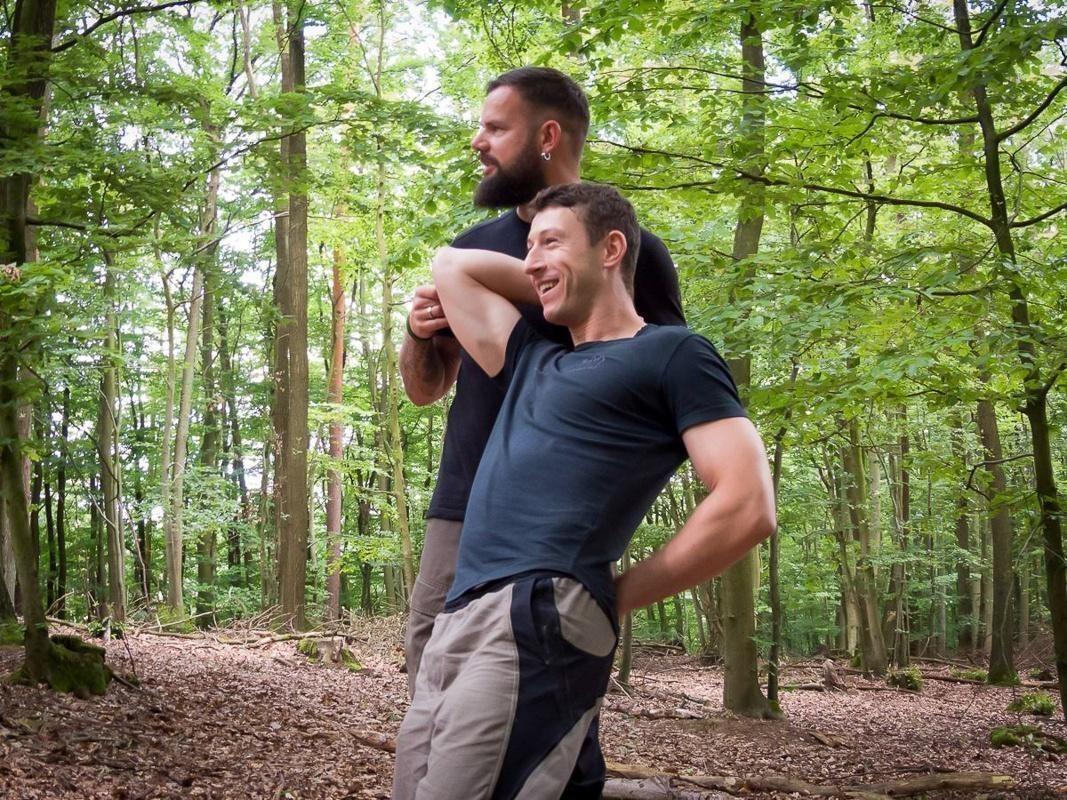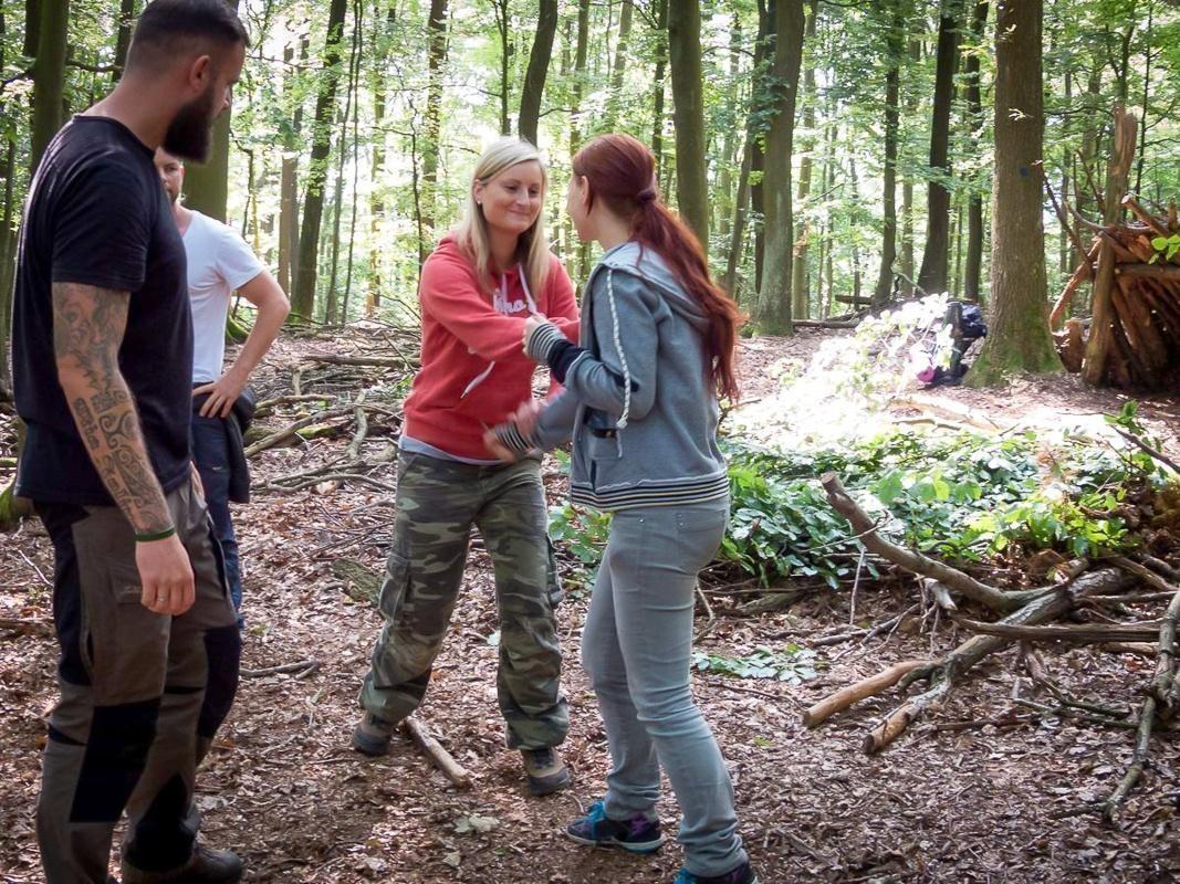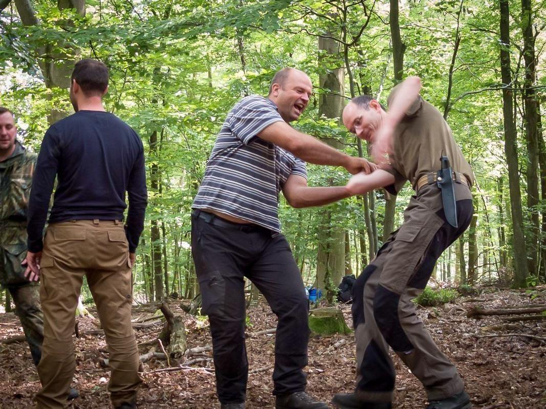 Zwei Personen üben eine Technik zur Selbstverteidigung im Wald