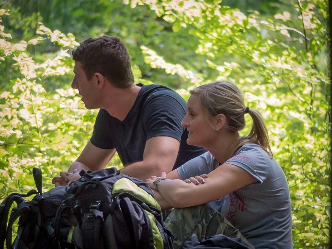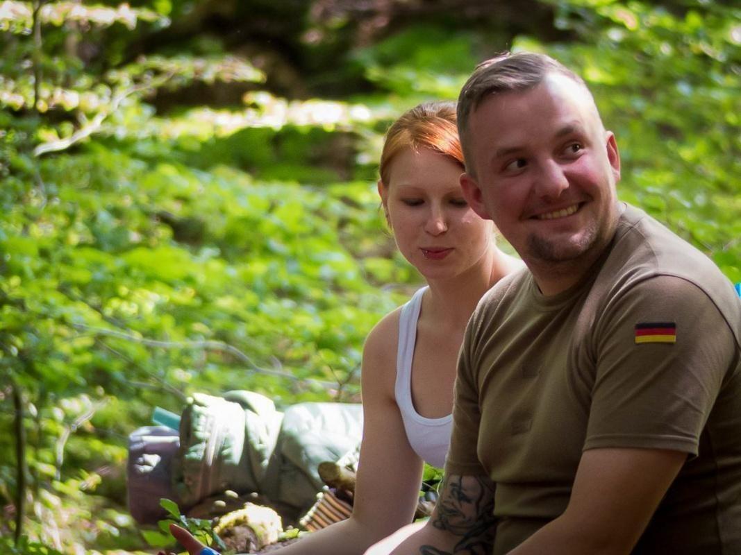 Zwei Personen sitzen in einem Wald neben Rucksäcken und Ausrüstung