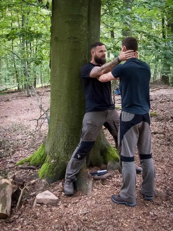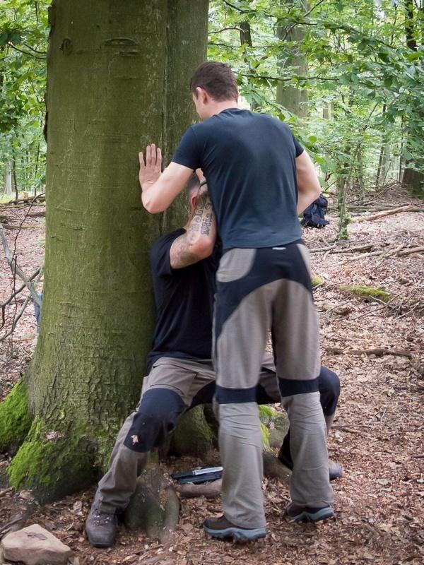 Zwei Personen üben eine Selbstverteidigungstechnik an einem Baum im Wald